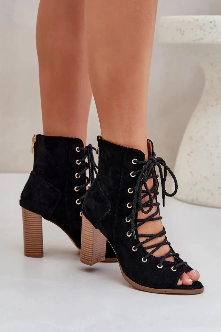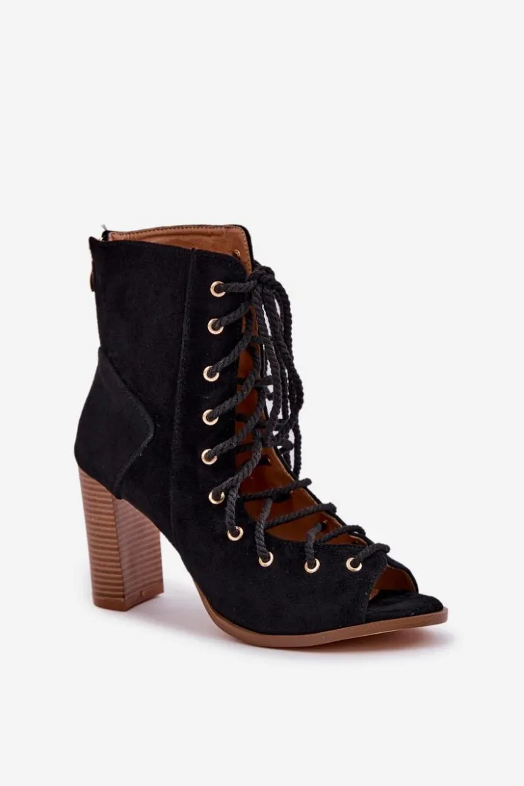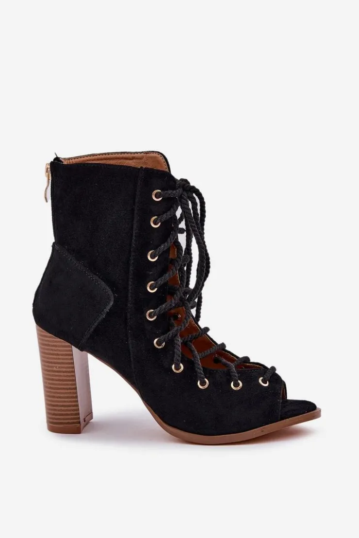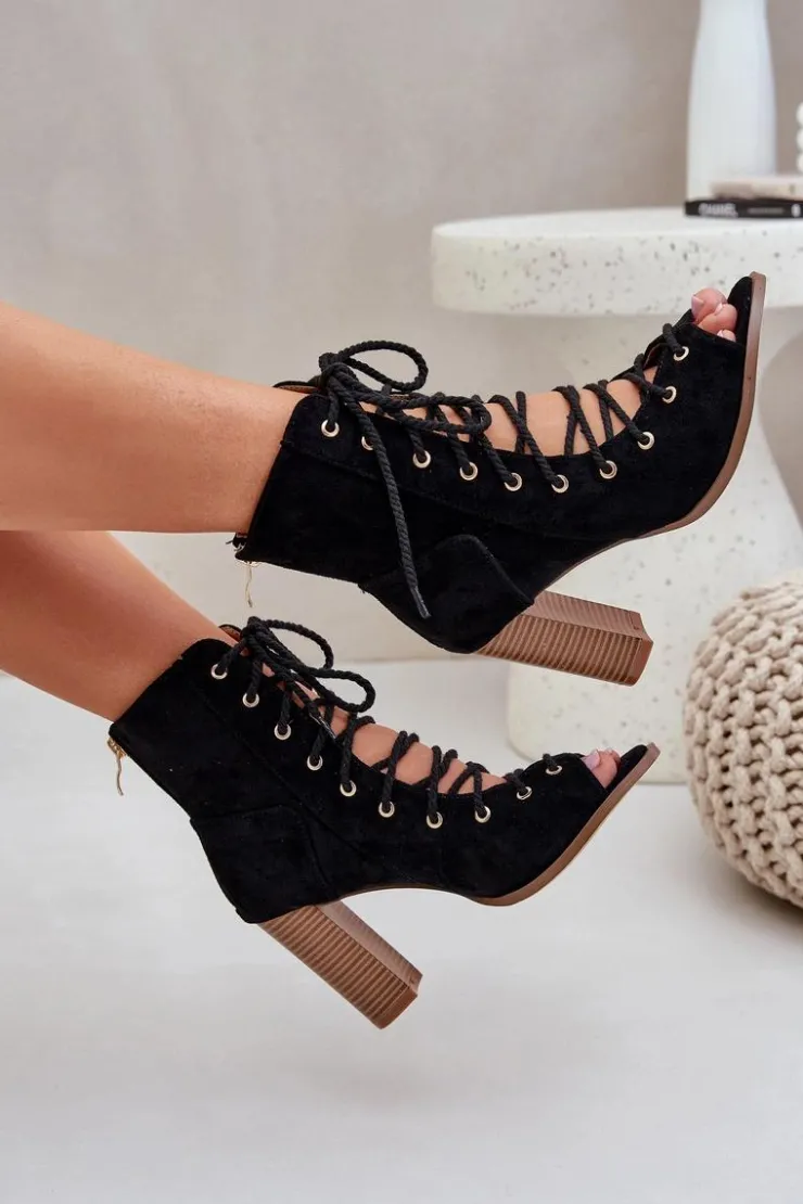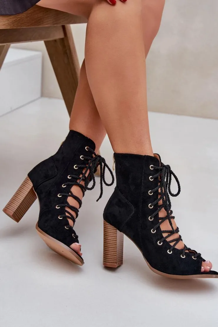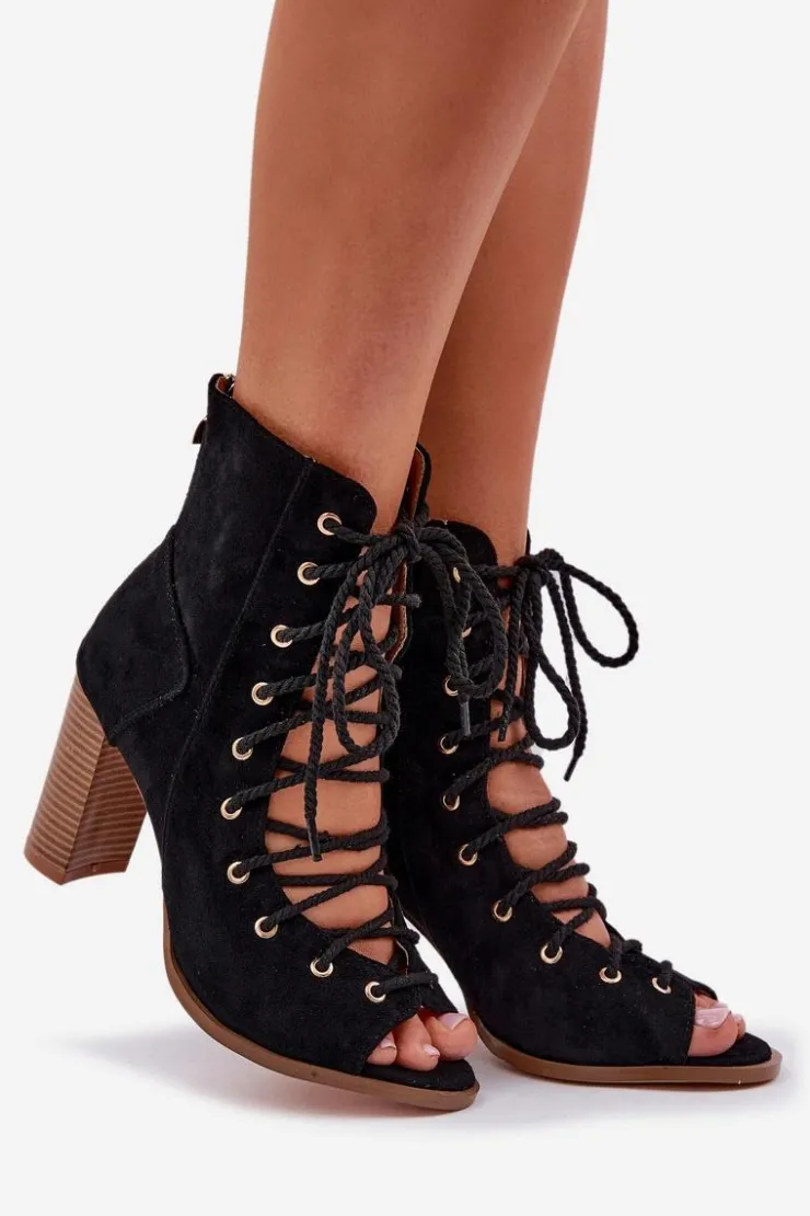 Sandały damskie z eko zamszu to elegancka propozycja na ciepłe dni. Osadzone na obcasie słupku, który zapewnia stabilność i wygodę. Sznurowana cholewka dodaje im nowoczesnego, a zarazem kobiecego charakteru, natomiast z tyłu znajdujące się zapięcie na zamek ułatwia ich zakładanie i zdejmowanie. Te sandały świetnie komponują się w letnich stylizacjach, łącząc styl, komfort i funkcjonalność. Przy wyborze rozmiaru prosimy sugerować się tabelą rozmiarów.