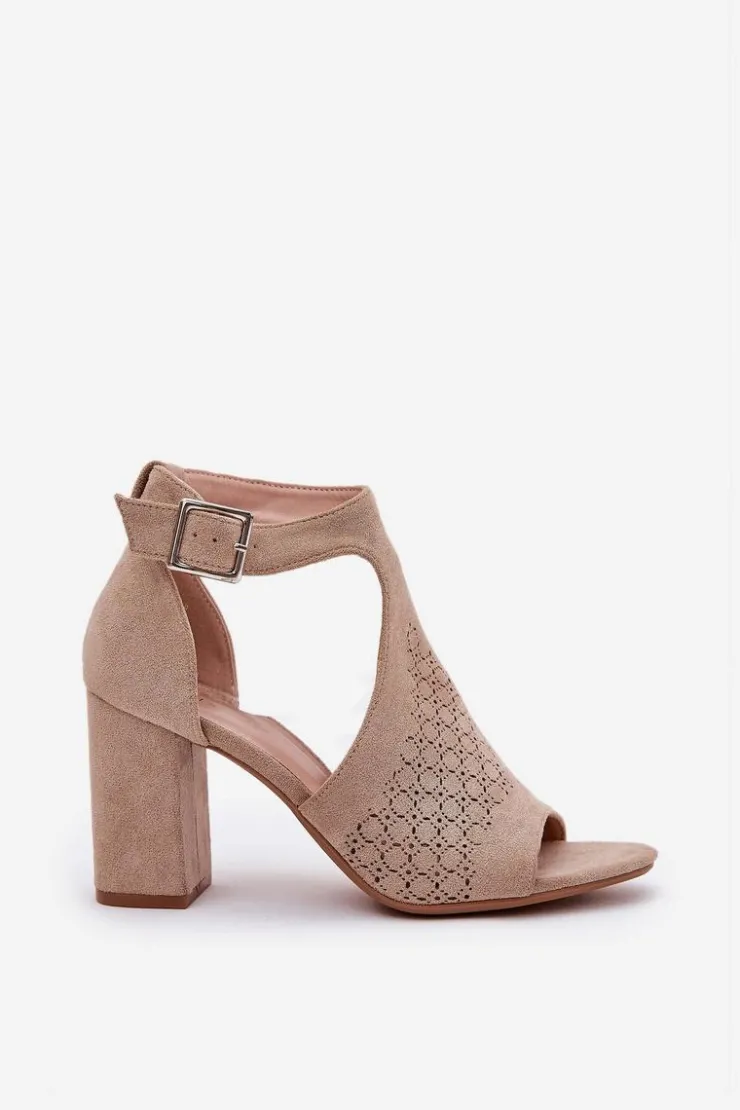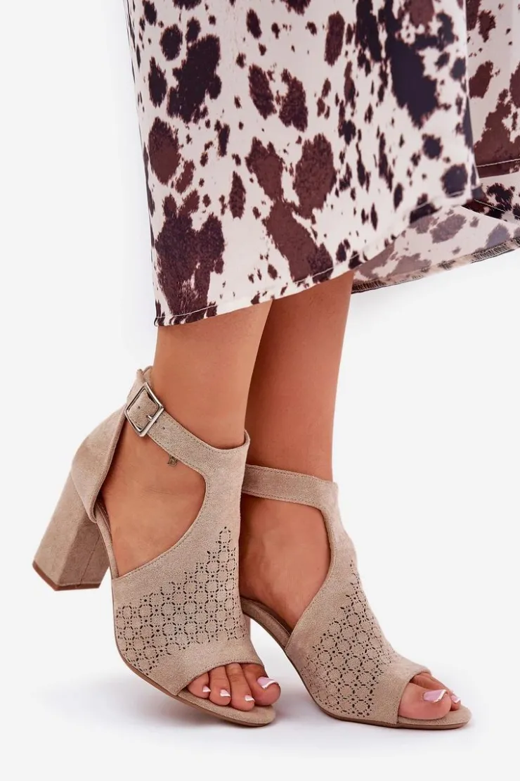 Sandały damskie z eko zamszu, ozdobione subtelnym ażurowym wzorem. Osadzone na stabilnym obcasie w formie słupka, zapewniają wygodę i elegancki wygląd. Model zapinany na sprzączkę, doskonale sprawdzi się na różne okazje. Przy wyborze rozmiaru prosimy sugerować się tabelą rozmiarów.