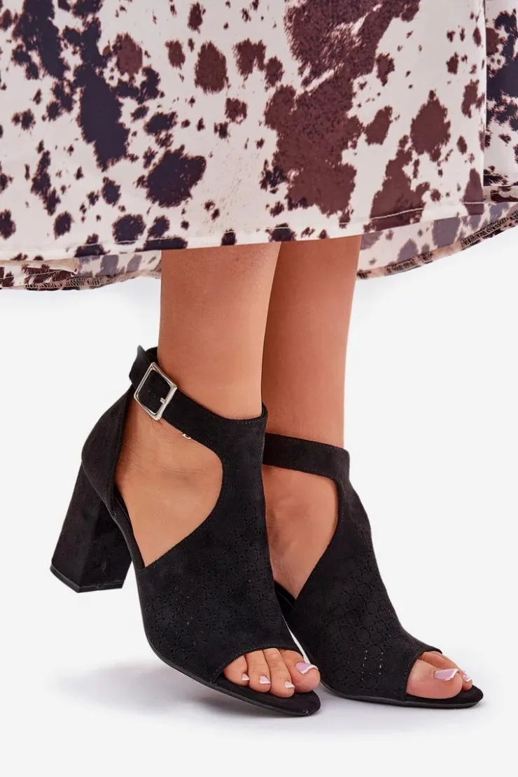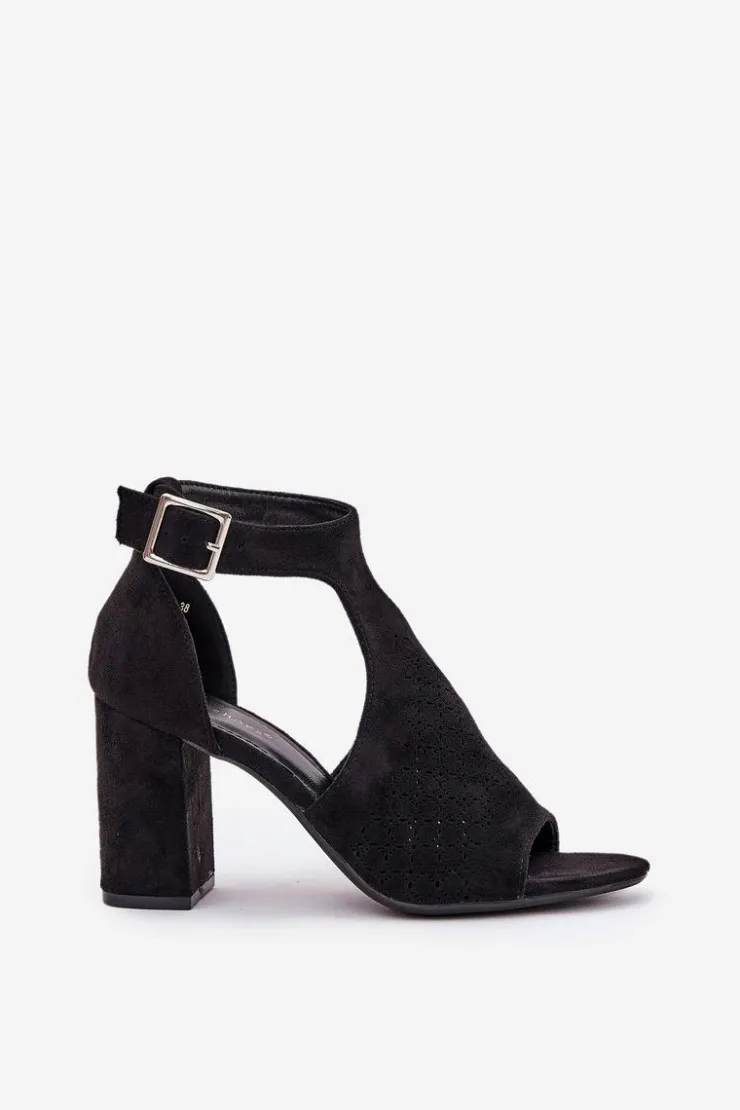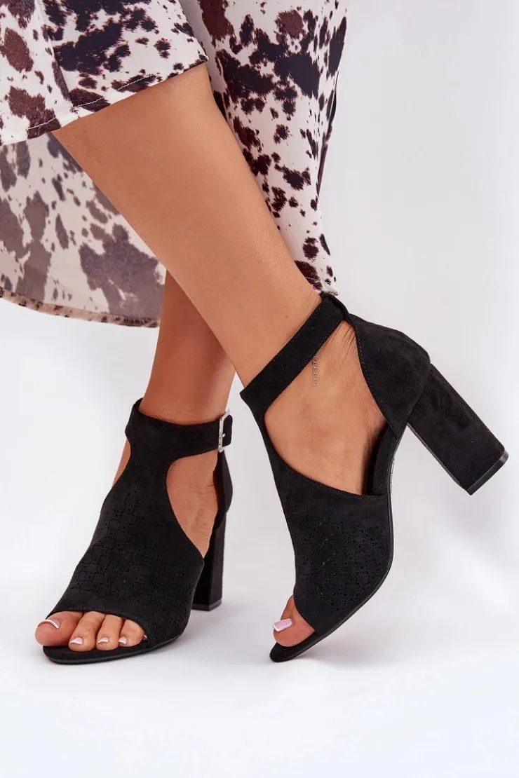 Sandały damskie z eko zamszu, ozdobione subtelnym ażurowym wzorem. Osadzone na stabilnym obcasie w formie słupka, zapewniają wygodę i elegancki wygląd. Model zapinany na sprzączkę, doskonale sprawdzi się na różne okazje. Przy wyborze rozmiaru prosimy sugerować się tabelą rozmiarów.
