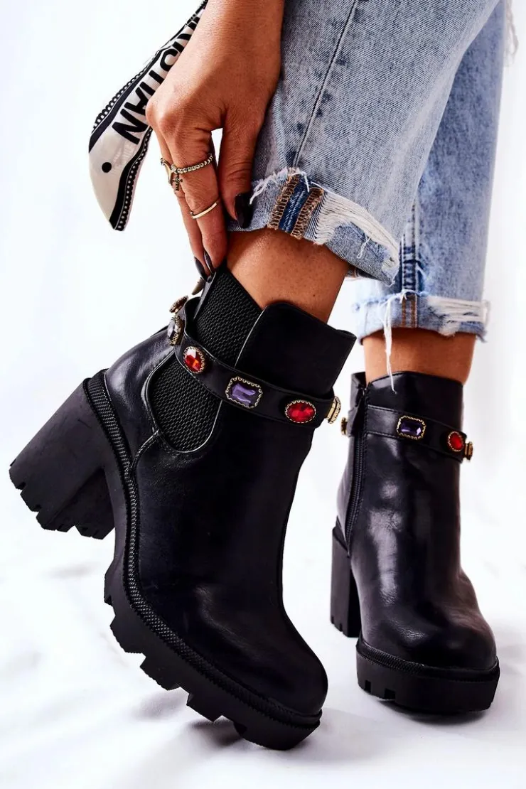 Damskie Boto Skórzane Botki Damskie Na Słupku Z Kryształami Czarne Makbet