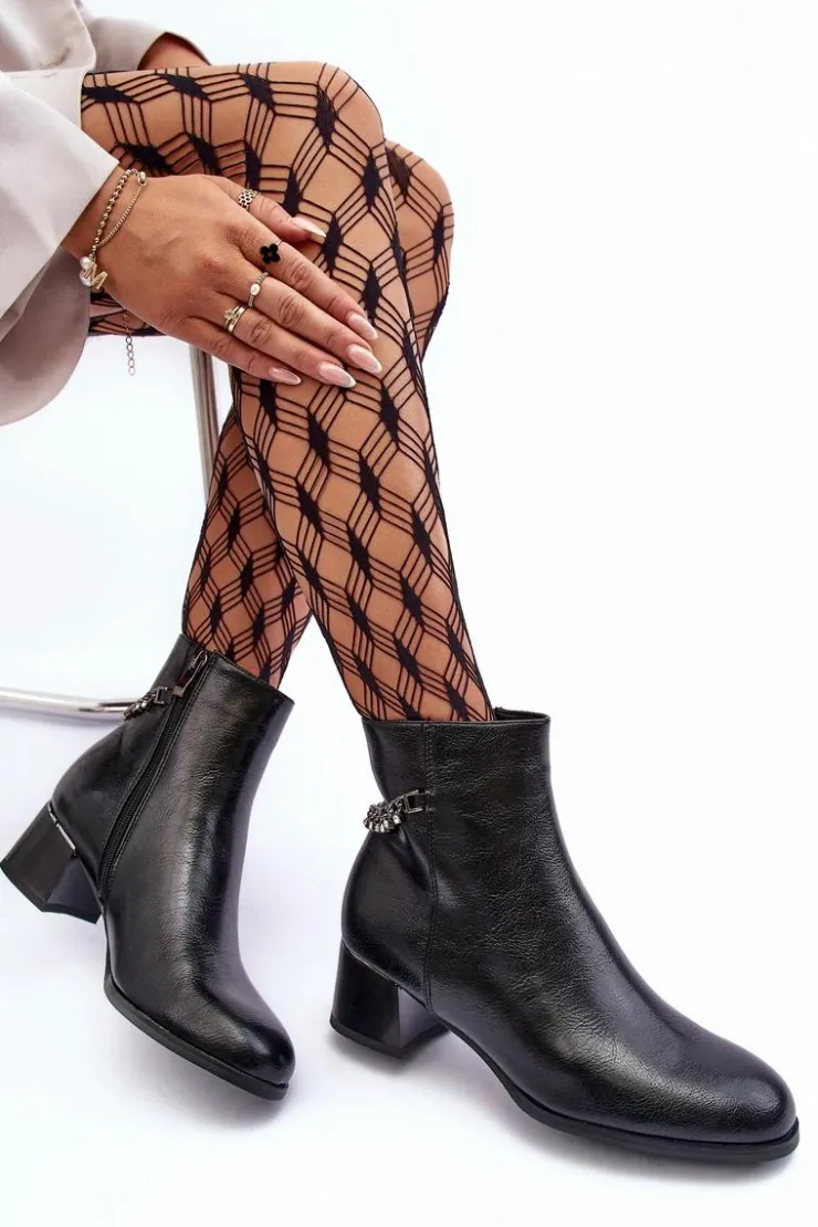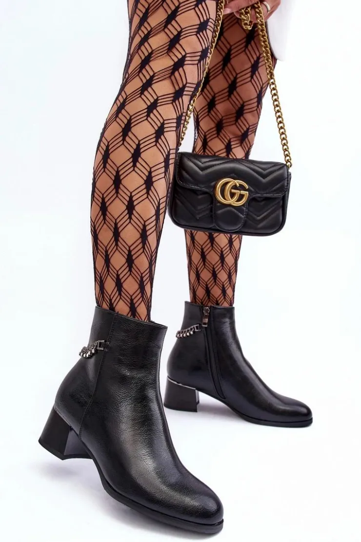 Klasyczne botki damskie osadzone na niskim obcasie z lustrzanym elementem. Wykonane z eko skóry. Zapinane na suwak po wewnętrznej stronie. Cholewka ozdobiona łańcuchem z dżetami. Wnętrze ocieplone kocem obuwniczym. Zapiętek usztywniony, noski zaokrąglone. Przy wyborze rozmiaru prosimy sugerować się tabelą rozmiarów.