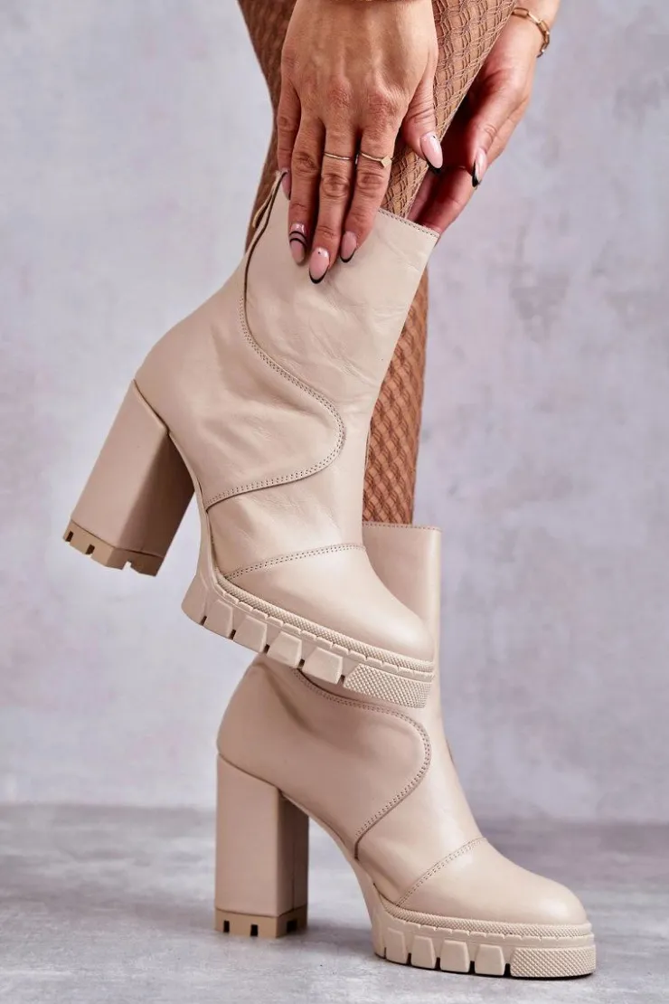 Klasyczny model o fasonie traperów na obcasie. Modne żłobienia po bokach podeszwy. Botki osadzone na delikatnej platformie oraz obcasie w formie słupka. Botki zostały wykonane z naturalnej skóry. Miękka wkładka zapewni komfort podczas użytkowania. Zapinane z tyłu cholewki na suwak. Dodatkowo zapiętek jest usztywniany. Przy wyborze rozmiaru prosimy sugerować się tabelą rozmiarów.