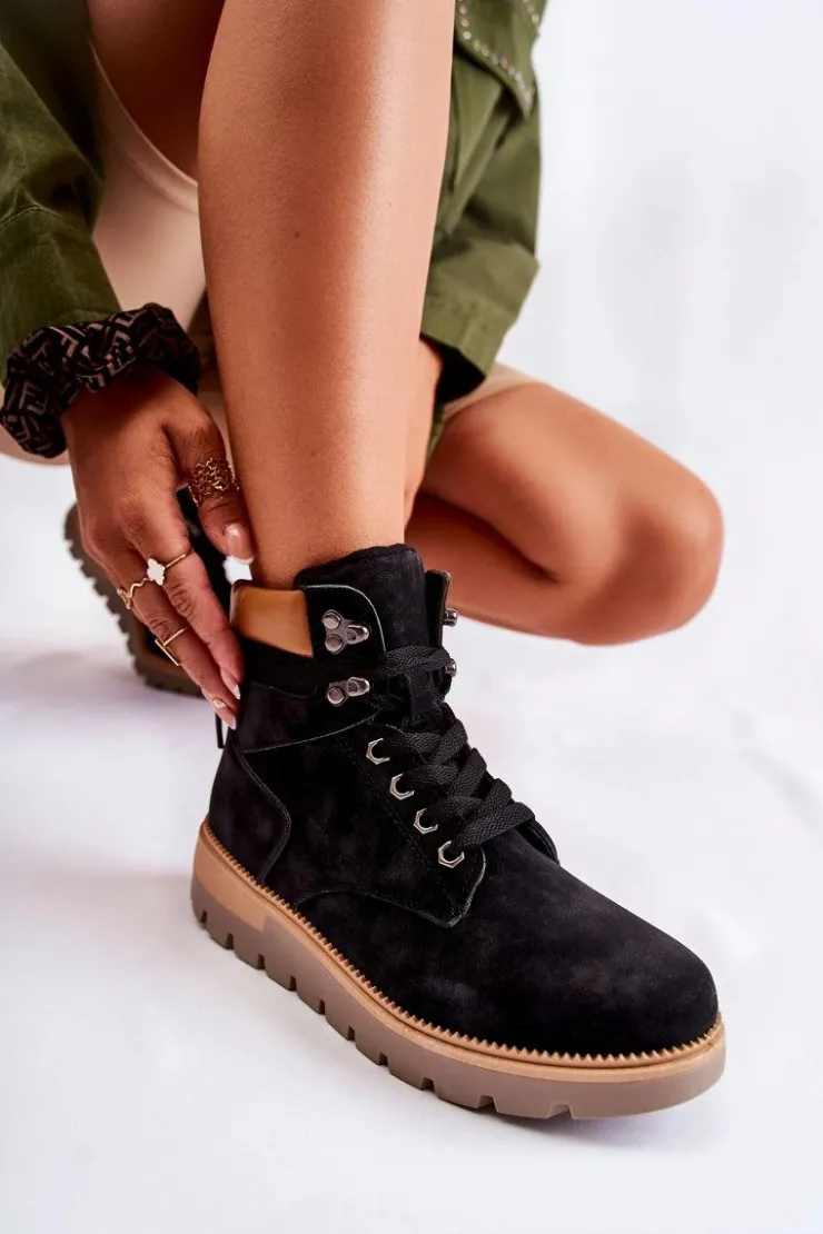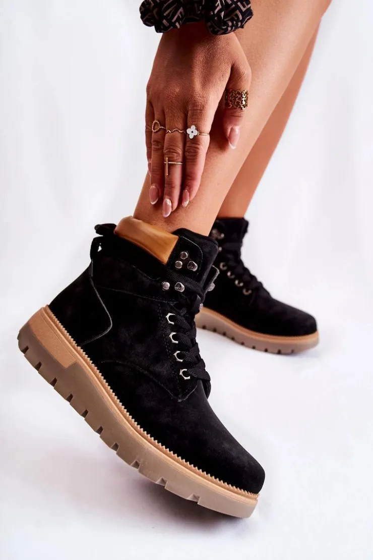 Botki damskie zostały wykonane z eko skóry. Model osadzony jest na platformie z charakterystycznymi żłobieniami. Posiadają zaokrąglony nosek. Cholewka zakrywająca kostkę z małą pętelką z tyłu ułatwiającą zakładanie obuwia. Wkładka oraz wyściółka ocieplone kocem obuwniczym. Klasyczne wiązanie na płaskie sznurowadła pozwoli na odpowiednie dopasowanie obuwia do tęgości nogi. Przy wyborze rozmiaru prosimy sugerować się tabelą rozmiarów.