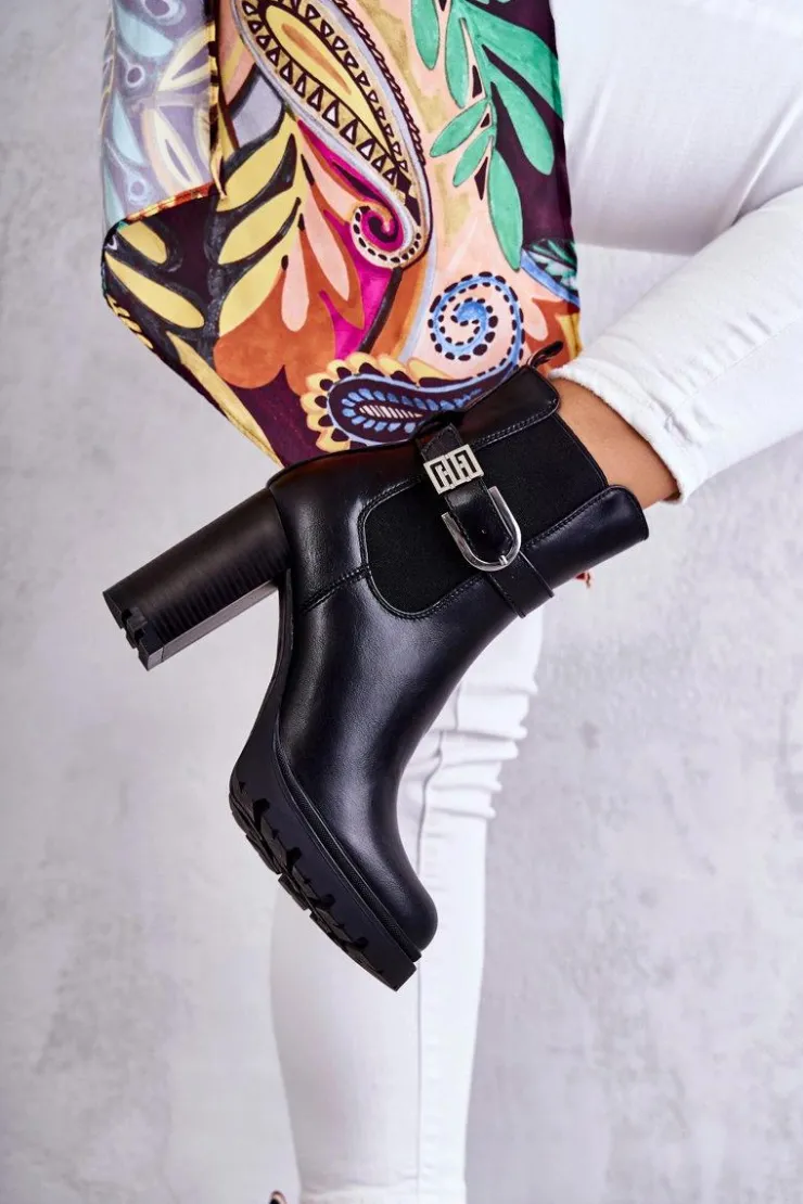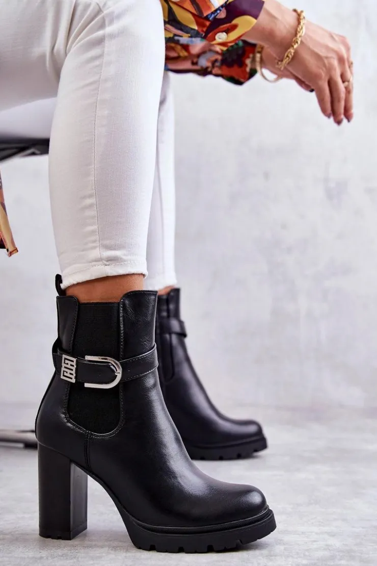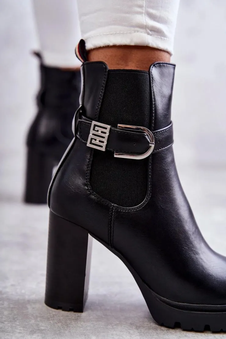 Spójrz tylko na te botki! Klasyka z elegancją w jednym! Botki zostały wykonane ze skóry ekologicznej. Posiadają z boku cholewki regulowany pasek oraz ozdobę. Botki zostały osadzone na obcasie w postaci słupka oraz platformie ze żłobieniami. Po wewnętrznej stronie znajduje się suwak ułatwiający zakładanie obuwia. Zapiętek jest usztywniany. Środek botków został ocieplony kocem obuwniczym. Przy wyborze rozmiaru prosimy sugerować się tabelą rozmiarów.