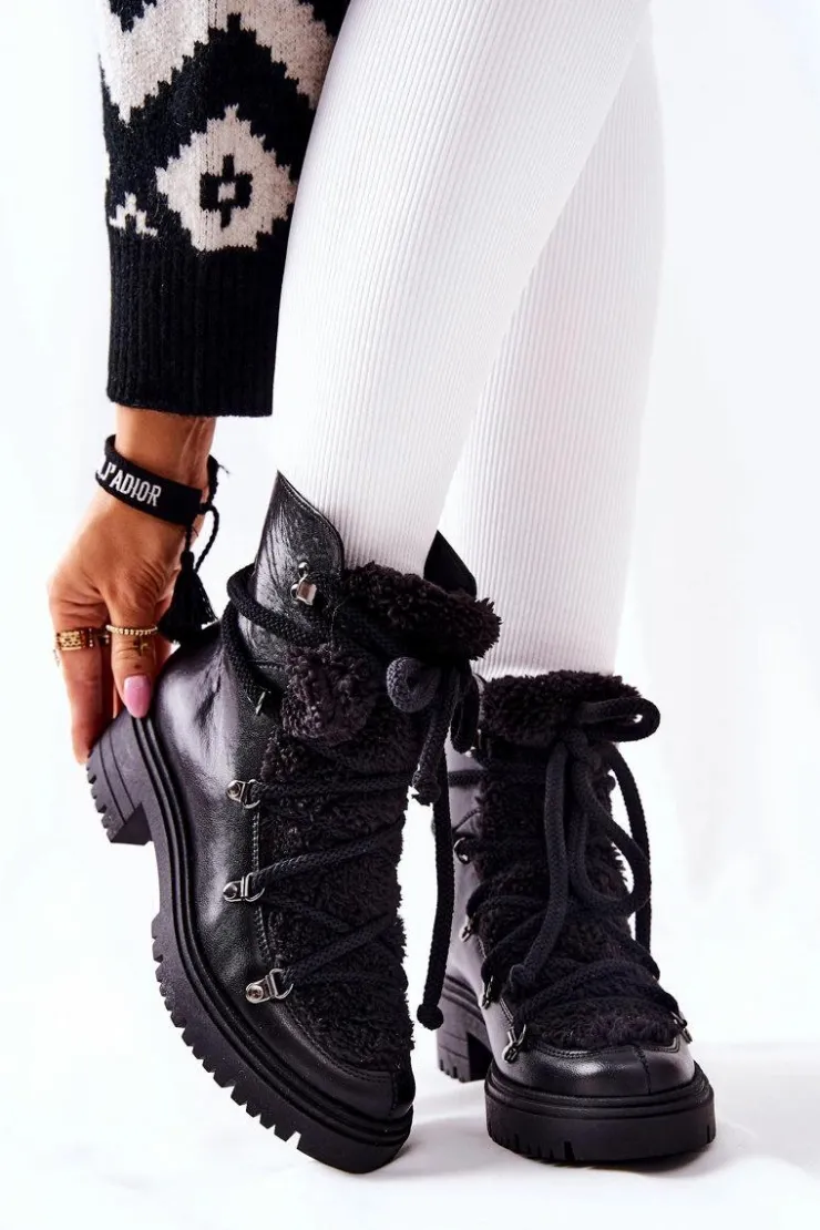 Ten model wprawia w zachwyt każdego, kto uwielbia wyróżniać się z tłumu! Ocieplany język botków, który został wykonany z przyjemnego w dotyku kożuszka sprawia, że trapery są niezwykle wyjątkowe! Zostały wykonane z naturalnej licowej skóry. Wkładka jest także skórzana. Posiadają wiązanie, które można dopasować do tęgości nogi. Buty osadzone są na płaskim obcasie i delikatnej platformie. Koniecznie musisz je mieć! Przy wyborze rozmiaru prosimy sugerować się tabelą rozmiarów.