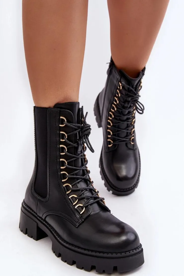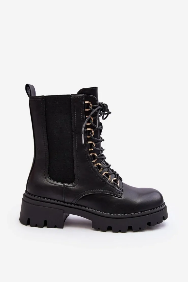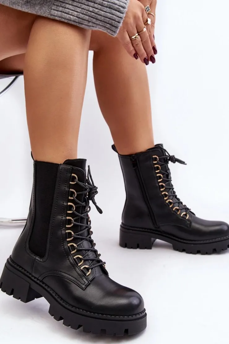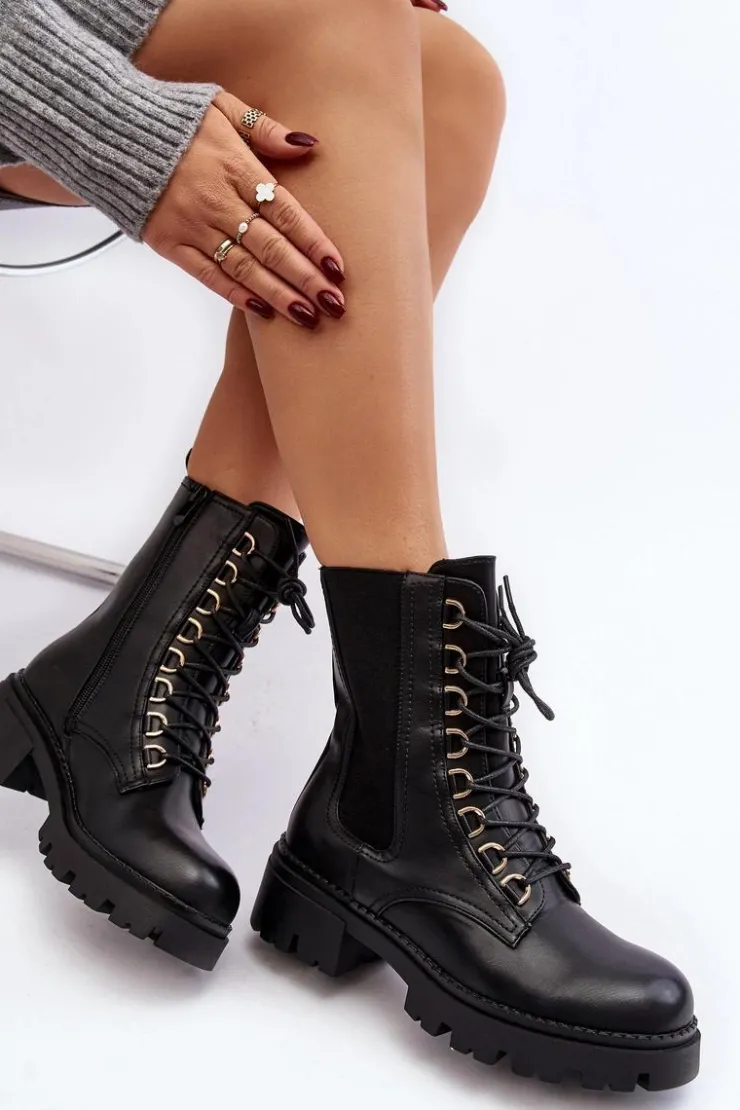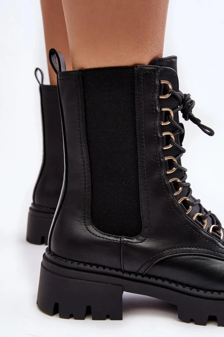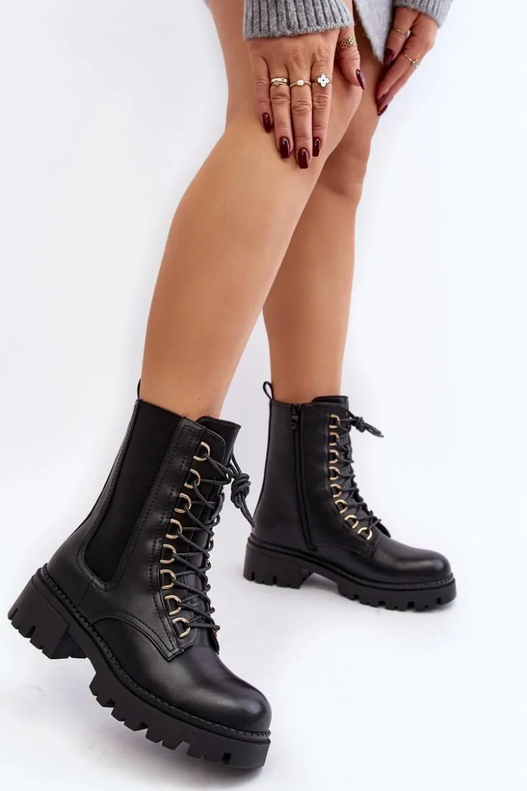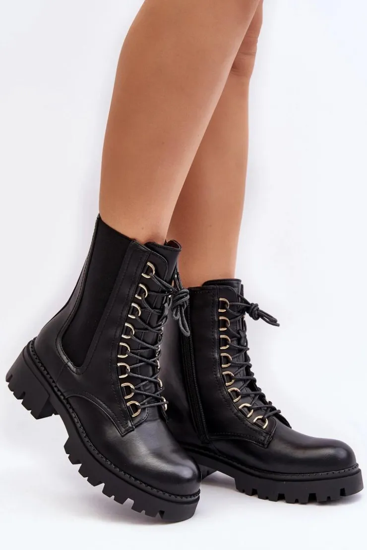 Damskie botki wykonane z eko skóry. Osadzone na płaskim obcasie. Na cholewce elastyczne wstawki. Noski zaokrąglone. Model ten zapinany jest na suwak z boku oraz dodatkowo posiada sznurowanie. Wnętrze ocieplone kocem obuwniczym. Świetny model do jesiennych i zimowych stylizacji! Przy wyborze rozmiaru prosimy sugerować się tabelą rozmiarów.