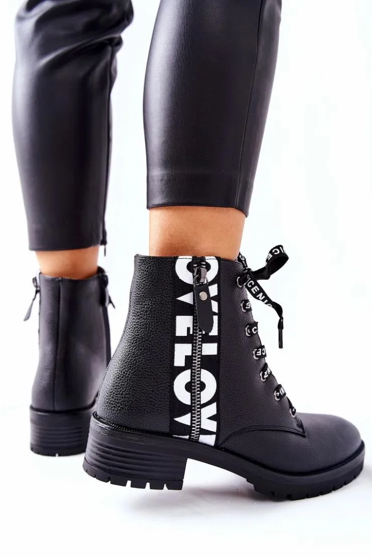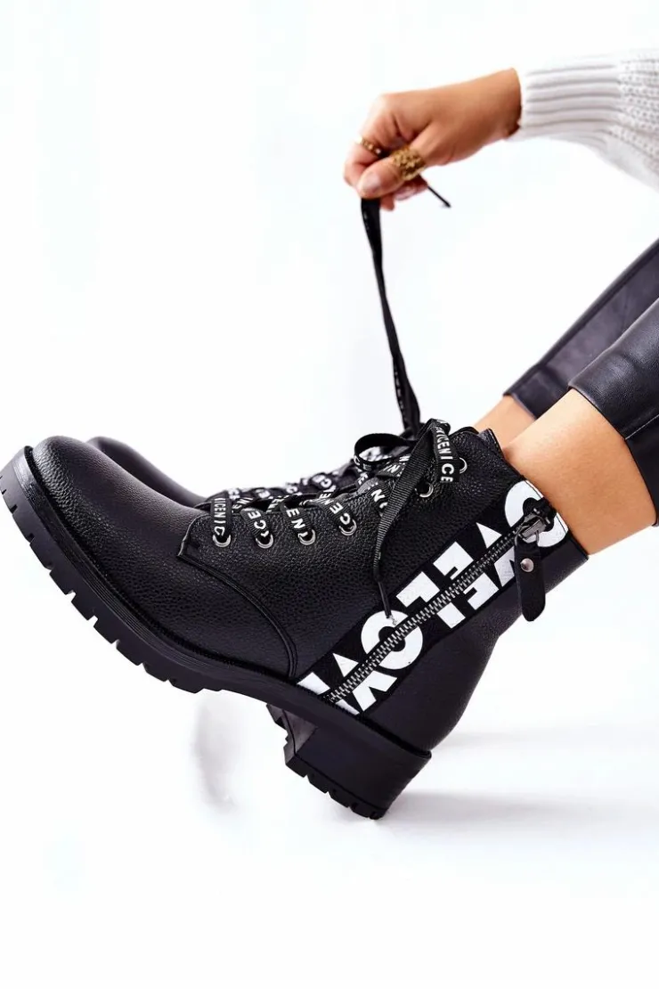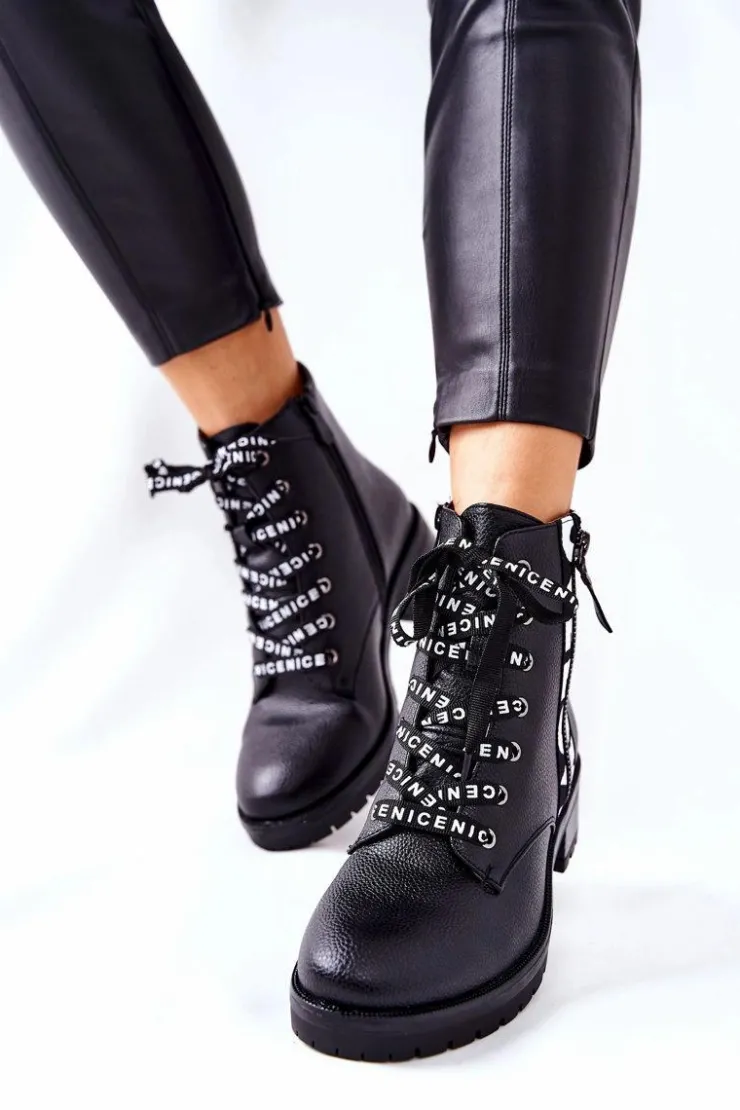 Piękne botki workery zostały wykonane z zewnątrz z eko skóry, natomiast w środku z materiału tekstylnego. Posiadają dwa suwaki, choć jeden z nich jest elementem ozdobnym. Ciekawy wzór na sznurówkach oraz z boku cholewki sprawia, że są naprawdę wyjątkowe. Workery są ocieplone kocem obuwniczym oraz posiadają miękką wkładkę. Przy wyborze rozmiaru prosimy sugerować się tabelą rozmiarów.