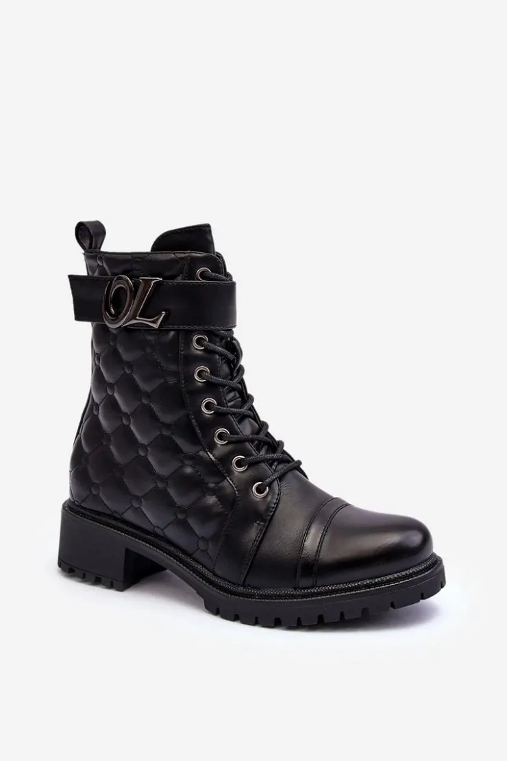 Modne damskie botki wykonane z eko skóry. Osadzone na platformie i płaskim, stabilnym obcasie. Na cholewce znajdują się liczne przeszycia oraz ozdoba na pasku. Zapinane na suwak po wewnętrznej stronie oraz dodatkowo sznurowane. Środek ocieplony kocem obuwniczym. Idealny model do jesiennych stylizacji! Przy wyborze rozmiaru prosimy sugerować się tabelą rozmiarów.