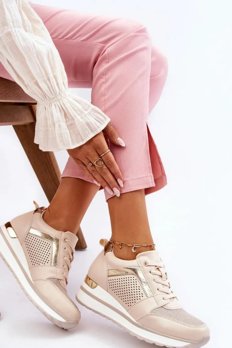 Wygodne sneakersy wykonane z eko skóry z delikatną perforacją po bokach cholewki oraz wstawką z przodu z materiału. Model klasycznie sznurowany. Buty zostały osadzone na platformie oraz niewysokim koturnie. Miękka wkładka zapewni komfortowe użytkowanie obuwia nawet przez cały dzień! Przy wyborze rozmiaru prosimy kierować się tabelą rozmiarów.
