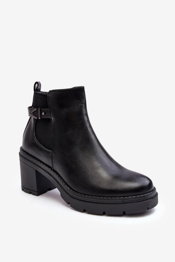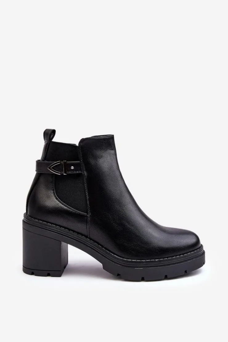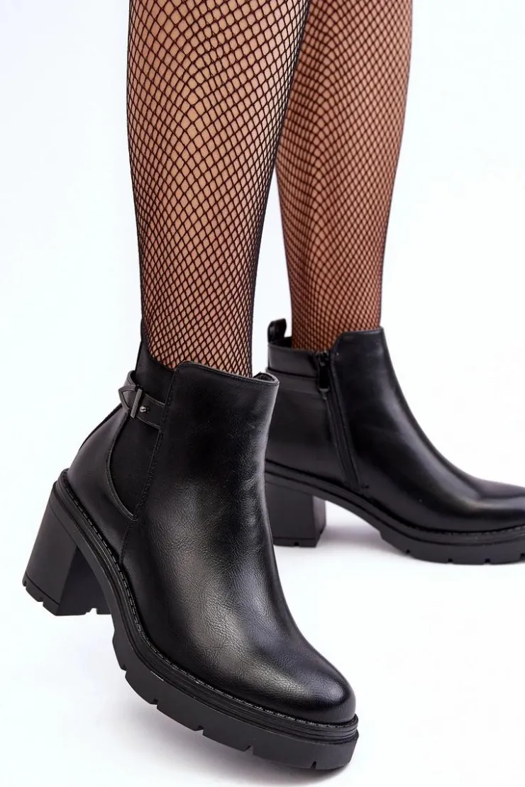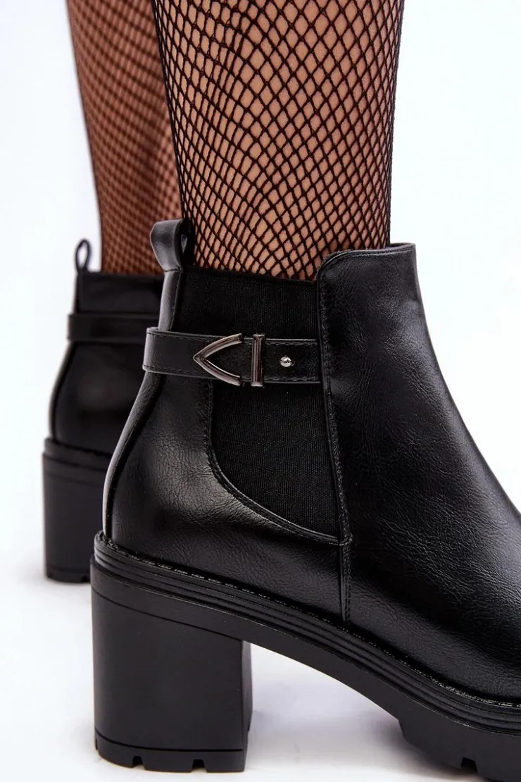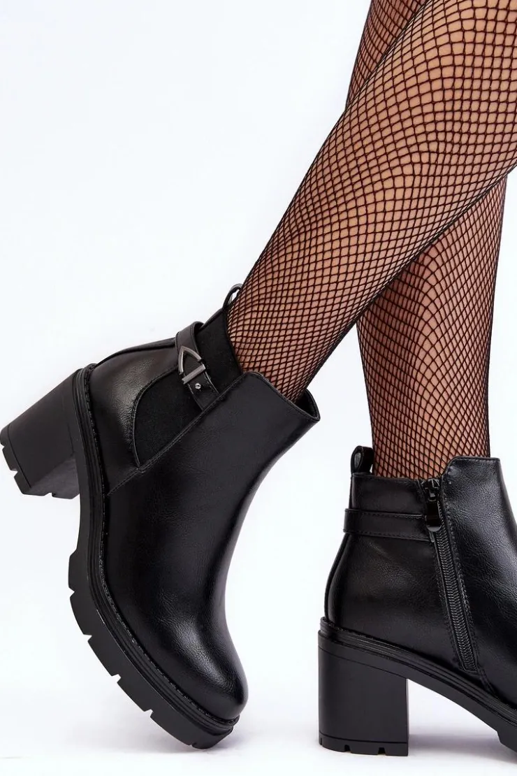 Damskie botki zostały wykonane z eko skóry. Osadzone na obcasie w postaci stabilnego, masywnego słupka. Cholewka została ozdobiona paskiem oraz elastyczną gumą pozwalającą na odpowiednie dopasowanie obuwia do tęgości nogi. Wewnątrz botki nie posiadają ocieplenia. Dodatkowo zapiętek jest usztywniony. Model ten posiada suwak z boku cholewki. Przy wyborze rozmiaru prosimy sugerować się tabelą rozmiarów.