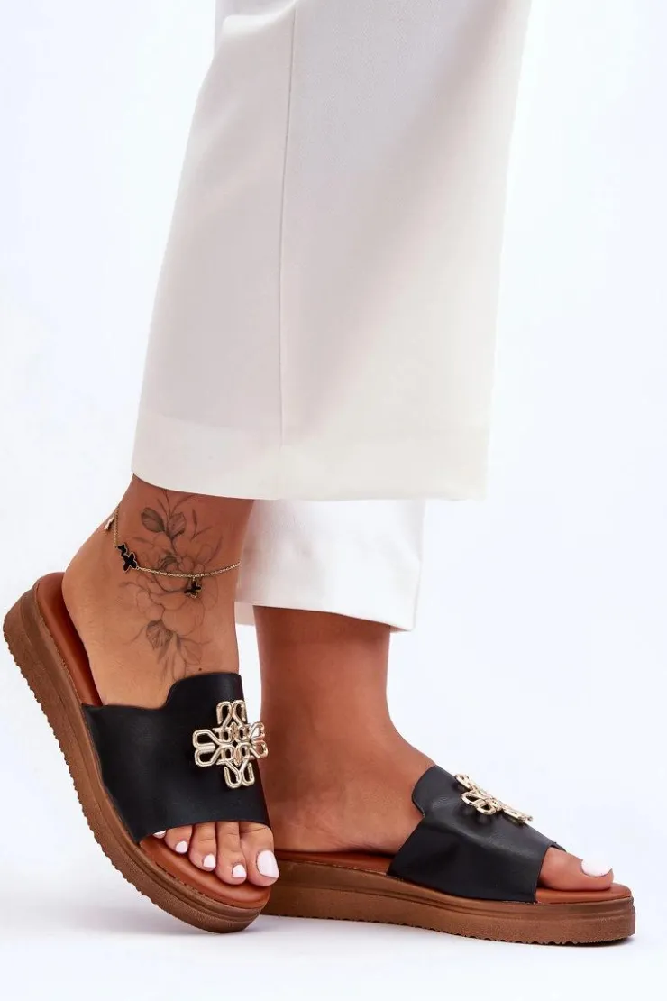 Klasyczne, damskie klapki zostały wykonane z eko skóry. Model ten posiada ozdobę wykonaną z tworzywa sztucznego. Klapki osadzono na grubej platformie. Wkładka jest bardzo miękka i wygodna w użytkowaniu. Ten model powinien znaleźć się właśnie w Twojej garderobie! Przy wyborze rozmiaru prosimy sugerować się tabelą rozmiarów.