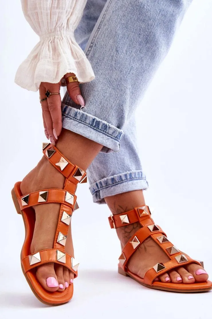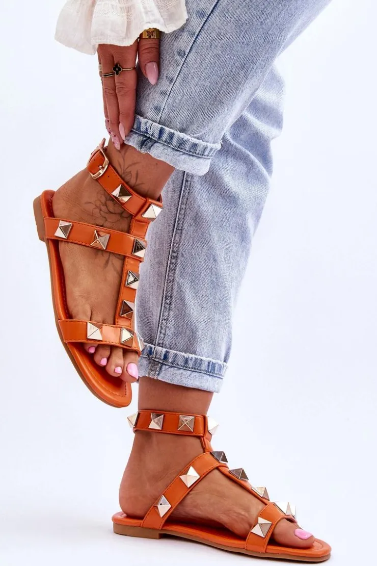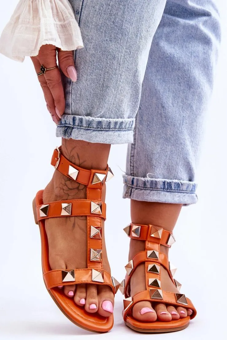 Damskie sandały zostały wykonane z eko skóry. Posiadają zapinanie w postaci regulowanego paska z klamrą. Dodatkowo zostały ozdobione dużymi ćwiekami. Sandały posiadają odkryte palce oraz piętę, co sprawia, że są niezwykle przewiewne. Osadzone na płaskim obcasie. Przy wyborze rozmiaru prosimy sugerować się tabelą rozmiarów.