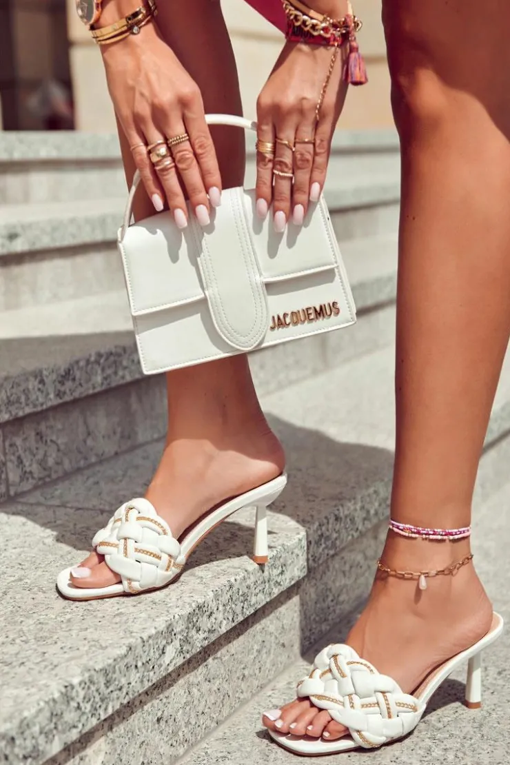 Cudowne klapki wykonane z wysokiej jakości eko skóry. Posiadają pleciony przód z ozdobnym, delikatnym łańcuszkiem. Osadzone na obcasie w postaci szpilki, dzięki któremu nogi będą wyglądać na bardziej smukłe. Wkładka wykonana z eko skóry jest bardzo miękka i komfortowa w użytkowaniu. Nosek odkryty, kwadratowy. Model, który skradnie serca niejednej miłośniczki wysokich obcasów! Koniecznie powinnaś je mieć! Ten fason będzie pasować do wielu stylizacji. Przy wyborze rozmiaru prosimy sugerować się tabelą rozmiarów.