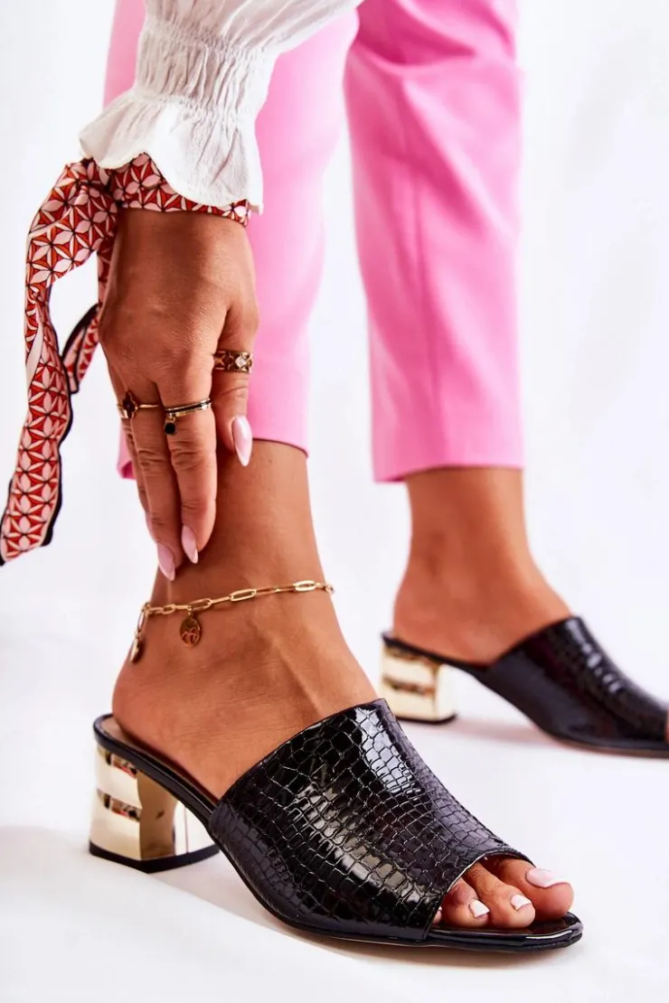 Damskie Boto Skórzane Klapki Damskie Wzór Krokodyl Na Obcasie Czarne Perry