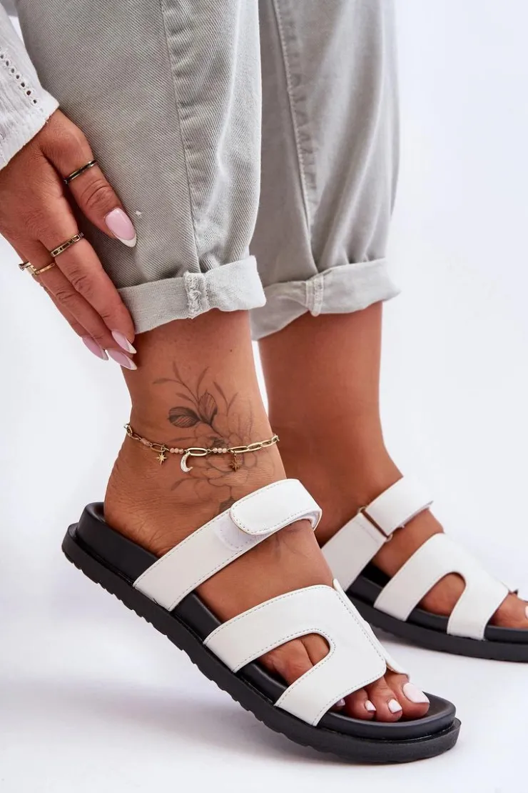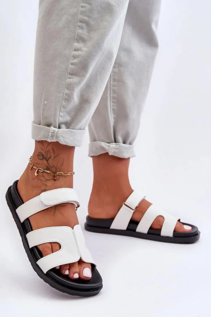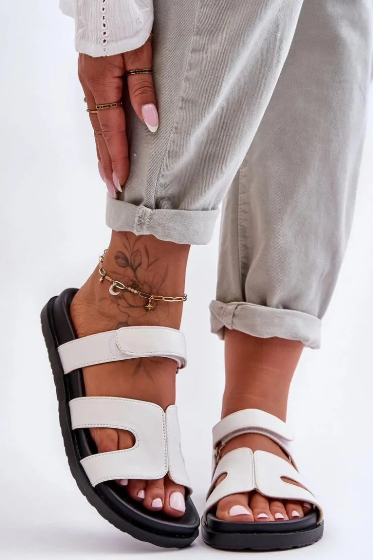 Klasyczne, wygodne klapki damskie zostały wykonane z eko skóry. Buty te zostały osadzone na lekkiej platformie. Dobrze wyprofilowana wkładka zapewni komfort podczas użytkowania. Model ten został wzbogacony o zapięcie na rzep, dzięki któremu obuwie można dopasować do tęgości nogi. Przy wyborze rozmiaru prosimy sugerować się tabelą rozmiarów.