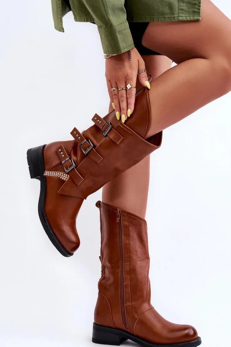 Klasyczne kozaki damskie wykonane z eko skóry. Osadzone na płaskim obcasie. Fason do połowy łydki zapinany na zamek. Miękka, materiałowa wkładka zapewni komfortowe użytkowanie. Na nieregularnej cholewce znajdują się ozdobne paski ze sprzączką. Przy wyborze rozmiaru prosimy kierować tabelą rozmiarów.