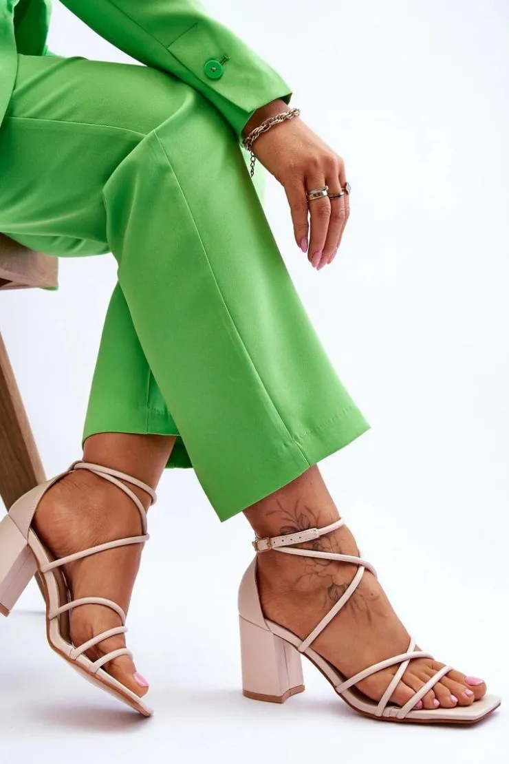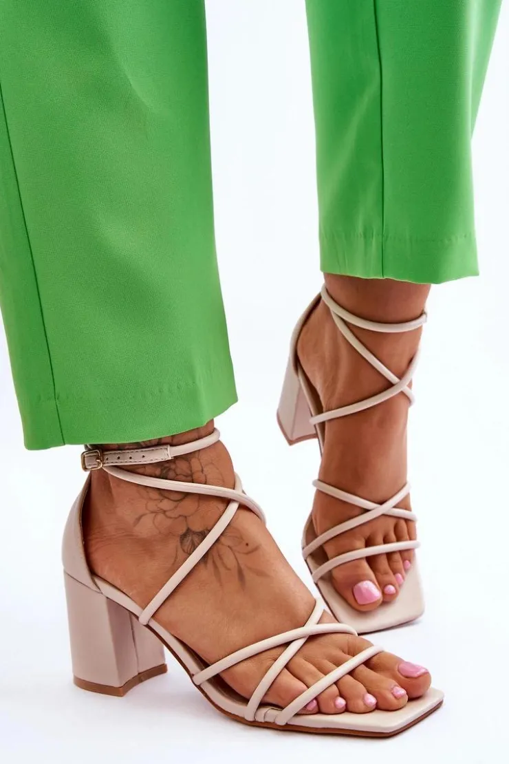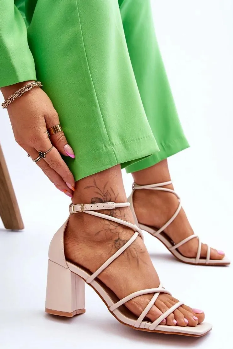 Modne sandałki na masywnym obcasie w postaci słupka zostały wykonane z eko skóry. Model ten posiada regulowany pasek zapinany na sprzączkę. Sandałki posiadają odkryty, kwadratowy nosek. Miękka wkładka została wykonana z eko skóry, co pozwoli na komfortowe użytkowanie obuwia. Idealny model do wielu stylizacji! Przy wyborze rozmiaru prosimy sugerować się tabelą rozmiarów.