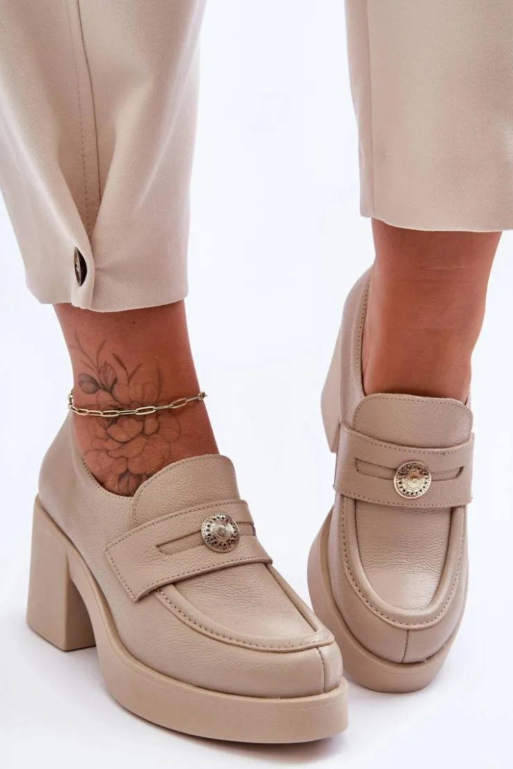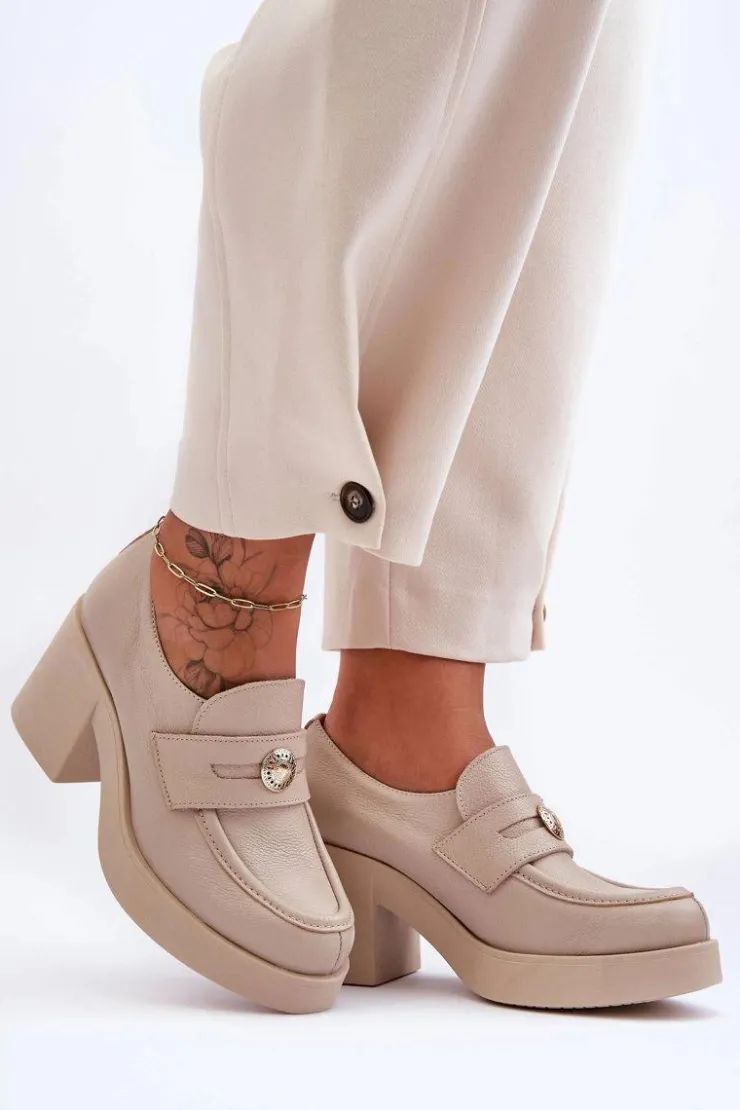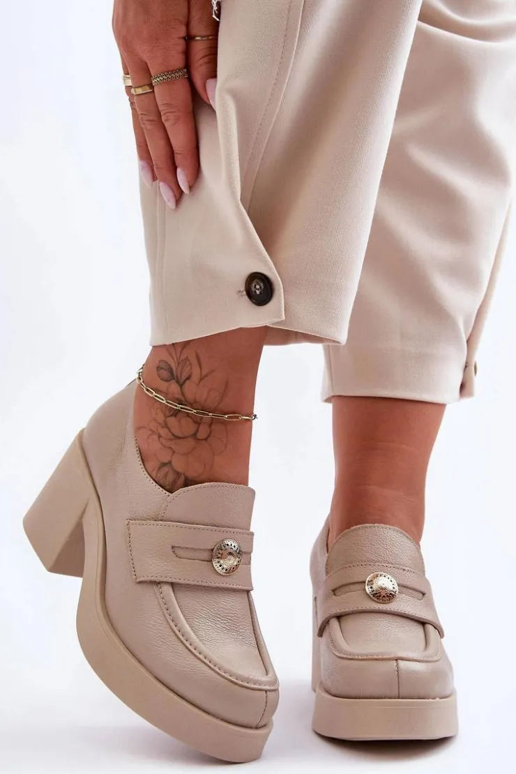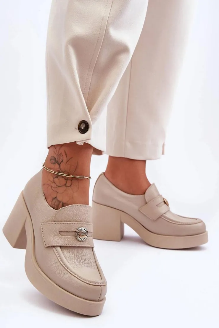 Damskie Boto Skórzane Półbuty Damskie Na Słupku Beżowe Lemar Dunadia