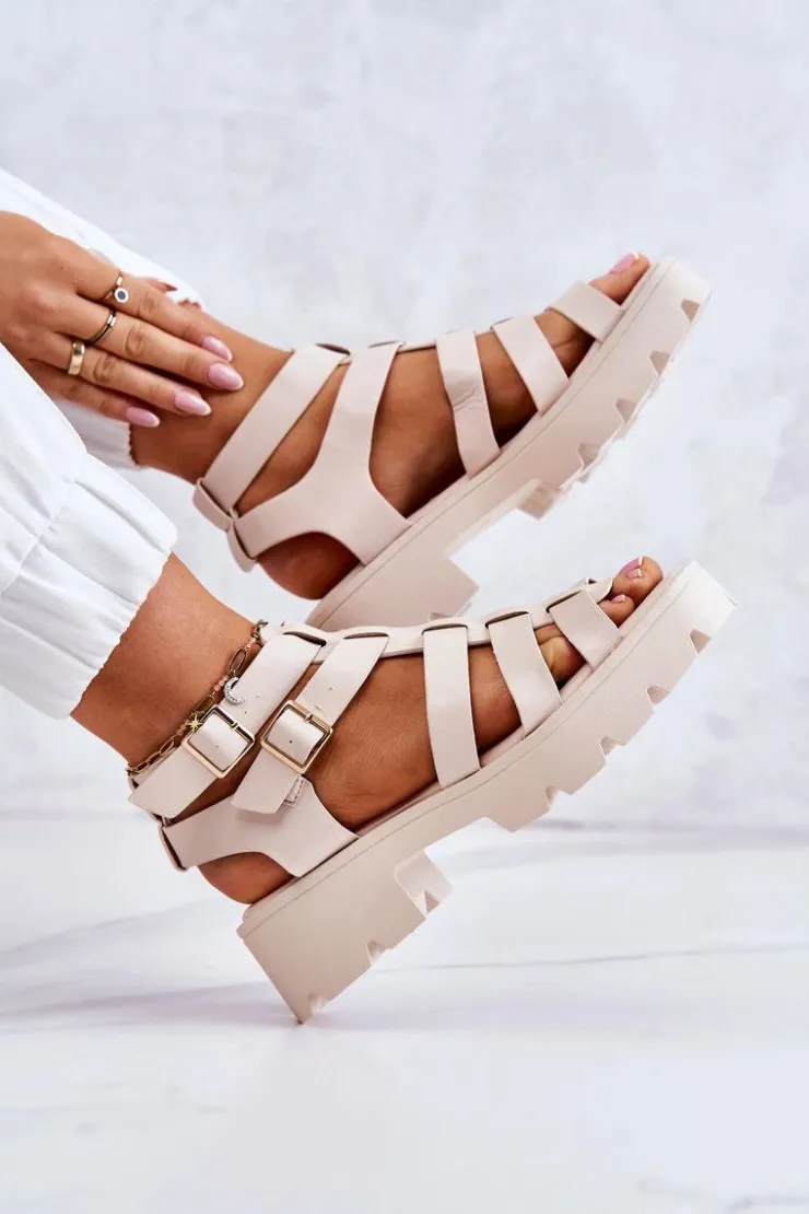 Przewiewne sandały wykonane z eko skóry. Paseczki świetnie podtrzymują stopę. Zapinane na regulowane paski ze sprzączką. Sandałki posiadają odkryty, kwadratowy nosek oraz odkrytą piętę. Miękka, eko skórzana wkładka zapewni wygodę podczas użytkowania. Płaski, masywny obcas oraz platforma sprawiają, że buty są niezwykle stabilne. Te sandałki to idealny fason na upalne dni. Świetnie będą prezentować się z zarówno ze spodniami, jak i sukienkami. Przy wyborze rozmiaru prosimy sugerować się tabelą rozmiarów.