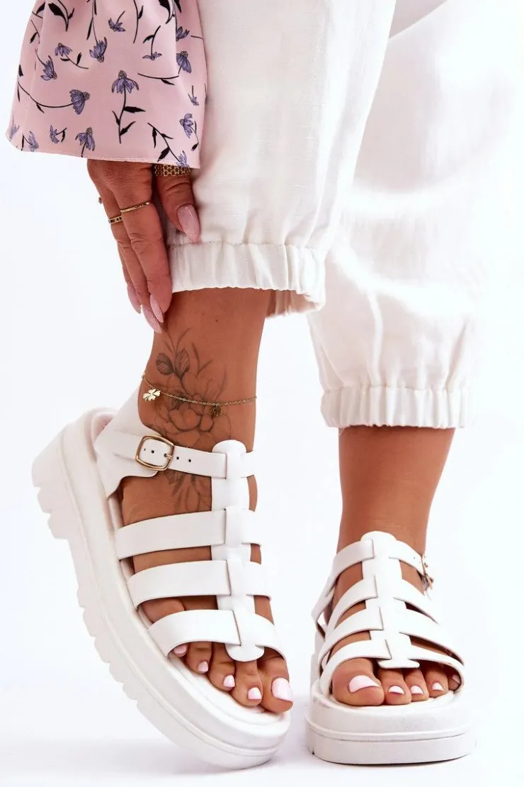 Przewiewne sandały damskie zostały wykonane z eko skóry. Zapinane na regulowany pasek ze sprzączką. Sandałki posiadają odkryty, lekko kwadratowy nosek oraz odkrytą piętę. Miękka, eko skórzana wkładka zapewni wygodę podczas użytkowania. Płaski obcas oraz platforma sprawiają, że buty są niezwykle stabilne. Te sandałki to idealny fason na upalne dni. Świetnie będą prezentować się z zarówno ze spodniami, jak i sukienkami. Przy wyborze rozmiaru prosimy sugerować się tabelą rozmiarów.