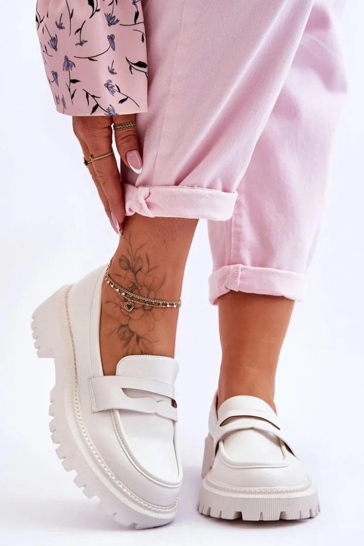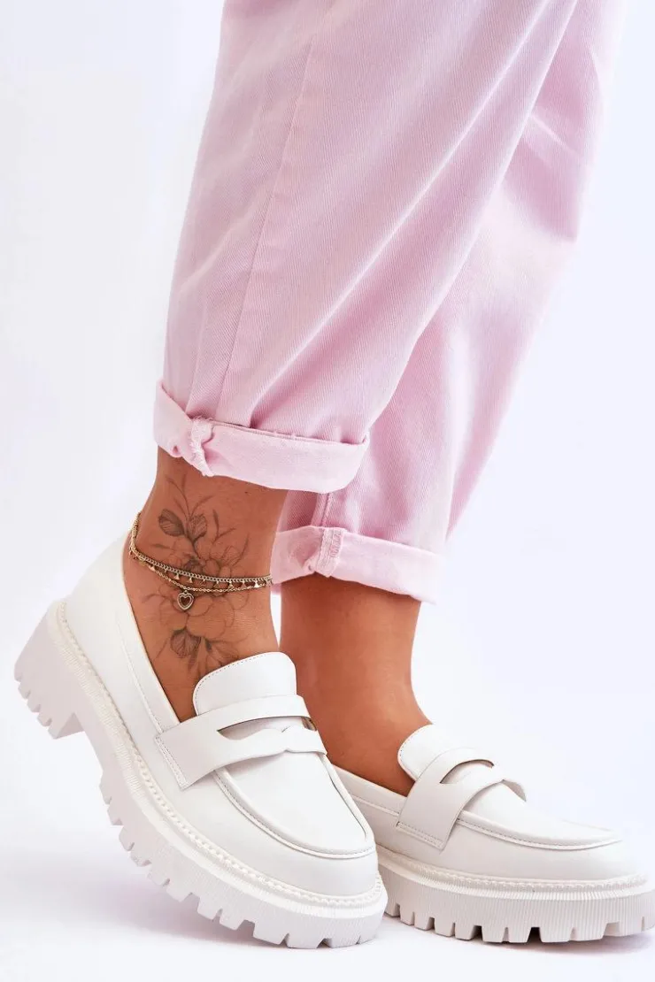 Wygodne, damskie mokasyny zostały wykonane z eko skóry. Model ten posiada na przodzie paseczek z delikatnym wycięciem. Mokasyny osadzono na płaskim, masywnym obcasie oraz platformie. Zapiętek został delikatnie usztywniony. Świetny model do wielu stylizacji w sezonie wiosenno-jesiennym. Przy wyborze rozmiaru prosimy sugerować się tabelą rozmiarów.