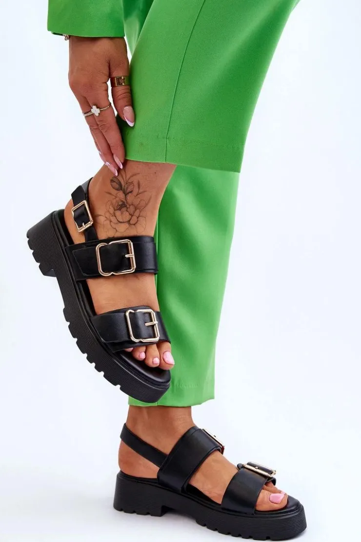 Wygodne sandały damskie zostały osadzone na płaskim obcasie oraz platformie. Wykonane z eko skóry z paskami i klamrami. Model ten posiada miękką wkładkę, która pozwoli na komfortowe użytkowanie obuwia nawet przez cały dzień! Zapinane wokół kostki na regulowany pasek z kwadratową sprzączką. Podeszwa wykonana z tworzywa sztucznego. Idealny model na letnie, upalne dni. Przy wyborze rozmiaru prosimy sugerować się tabelą rozmiarów.