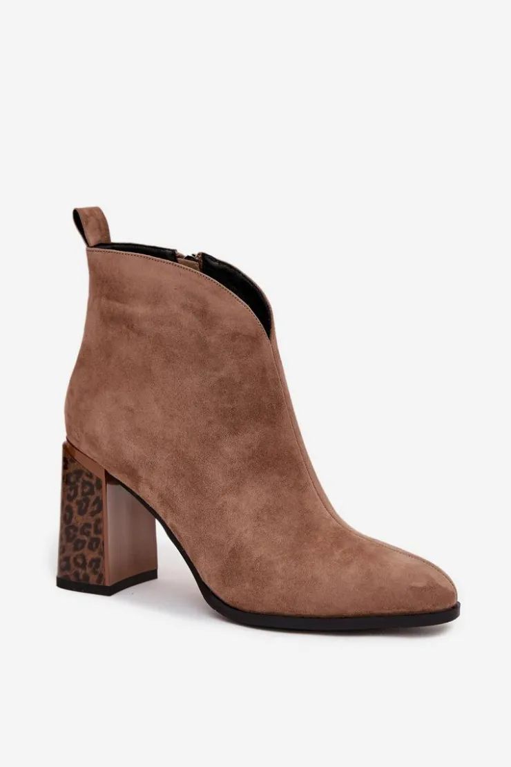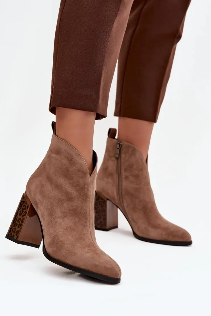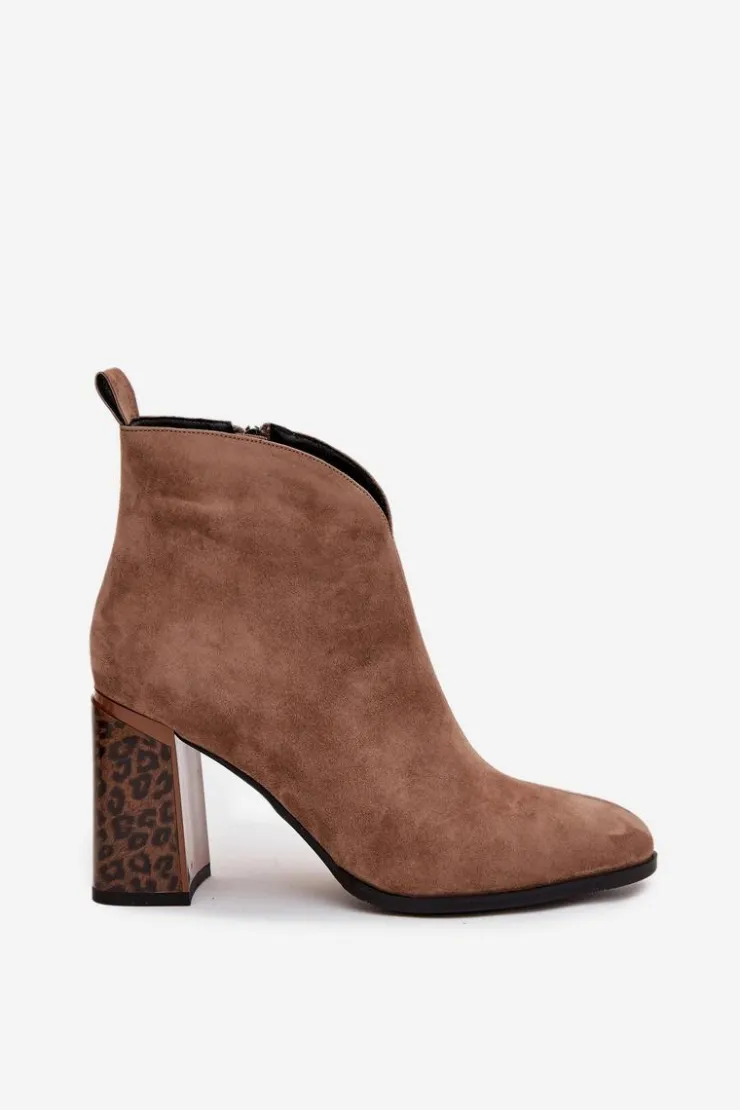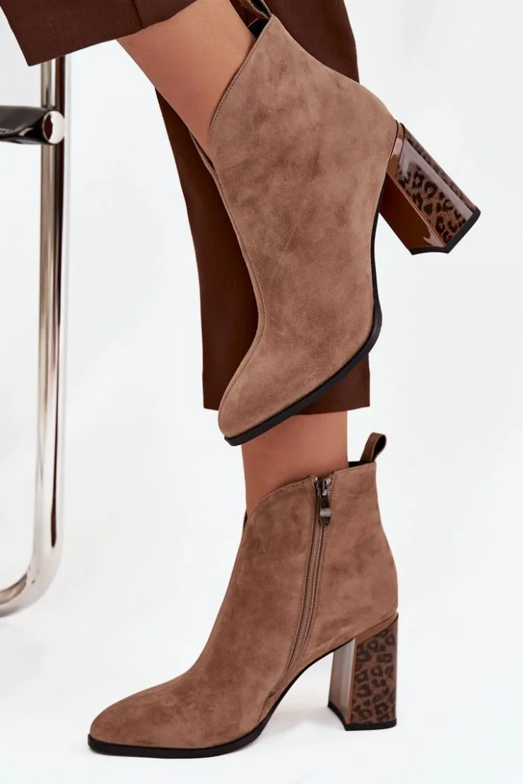 Botki damskie z naturalnego zamszu to propozycja łącząca klasykę z modnym akcentem. Zapinane na zamek, są wygodne w zakładaniu i zdejmowaniu. Osadzone na stabilnym obcasie typu słupek w panterkowy wzór, wyróżniają się oryginalnym wyglądem i przyciągają wzrok. Wnętrze butów zostało ocieplone kocem obuwniczym, co gwarantuje komfort i ciepło w chłodniejsze dni. Dodatkowym detalem jest przeszycie biegnące wzdłuż cholewki, które podkreśla elegancki charakter modelu. To botki idealne do jesiennych i zimowych stylizacji – świetnie sprawdzą się zarówno na co dzień, jak i w bardziej eleganckich zestawach.