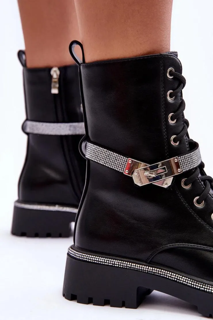 Modne botki damskie zostały wykonane z eko skóry. Botki te posiadają w środku ocieplenie w postaci miłego w dotyku koca obuwniczego. Model ten ozdobiony został małymi, błyszczącymi dżetami. Pasek na cholewce jest odpinany. Zapinane na suwak oraz dodatkowo posiadają sznurowanie. Płaski obcas i platforma ze żłobieniami. Zapiętek jest usztywniany. Idealne do wielu stylizacji. Przy wyborze rozmiaru prosimy sugerować się tabelą rozmiarów.