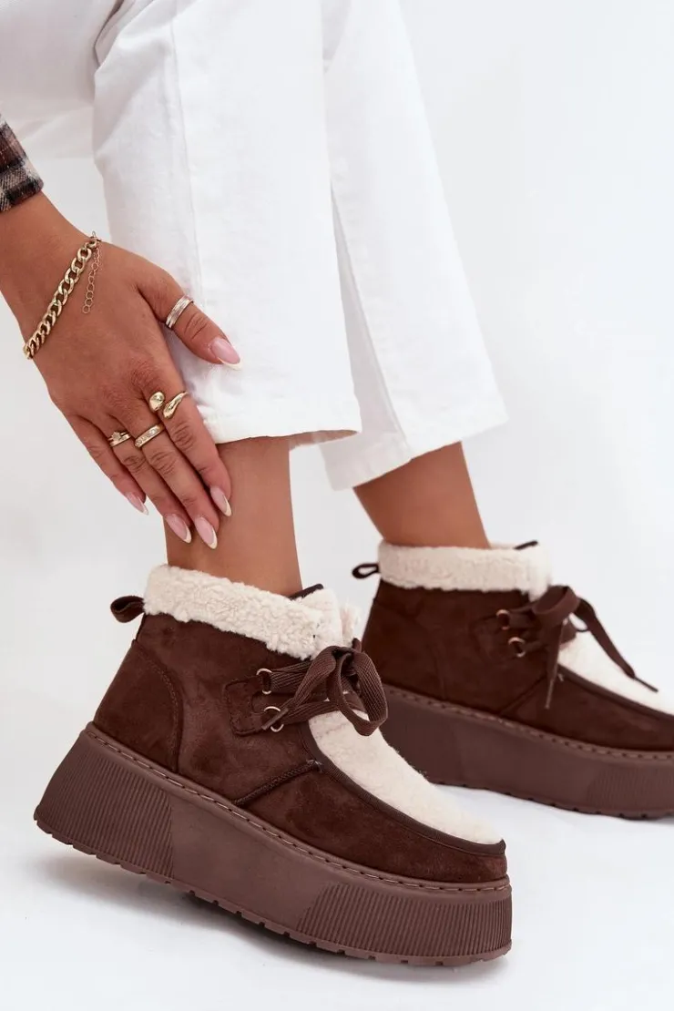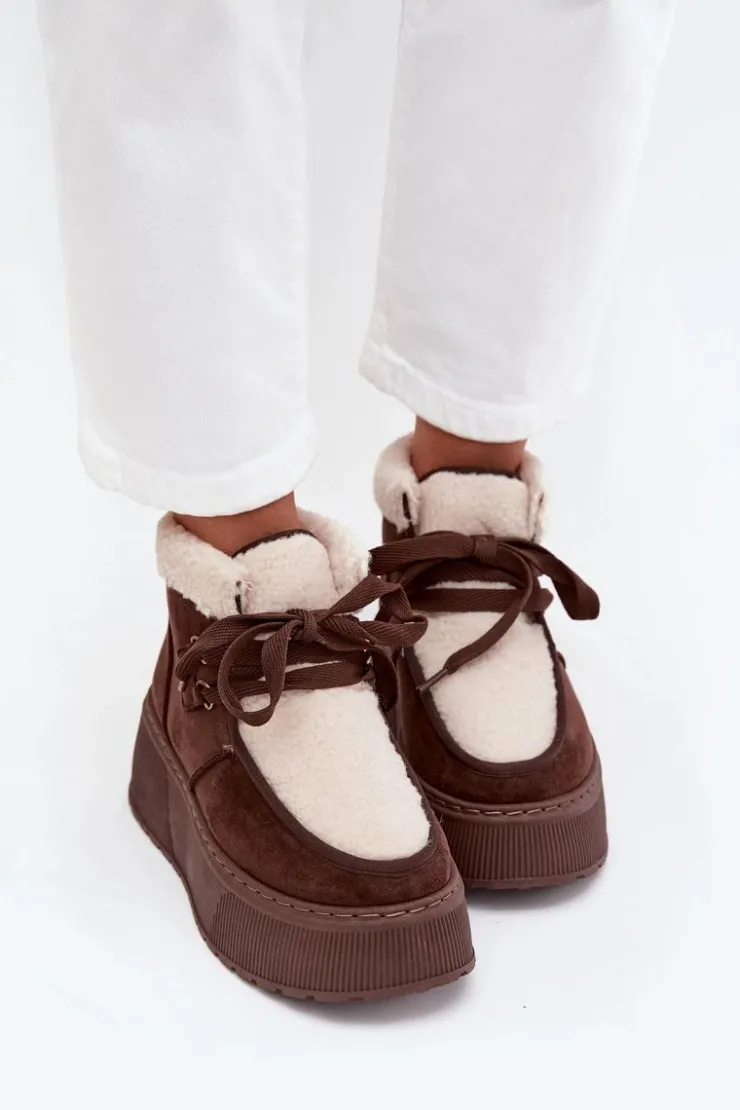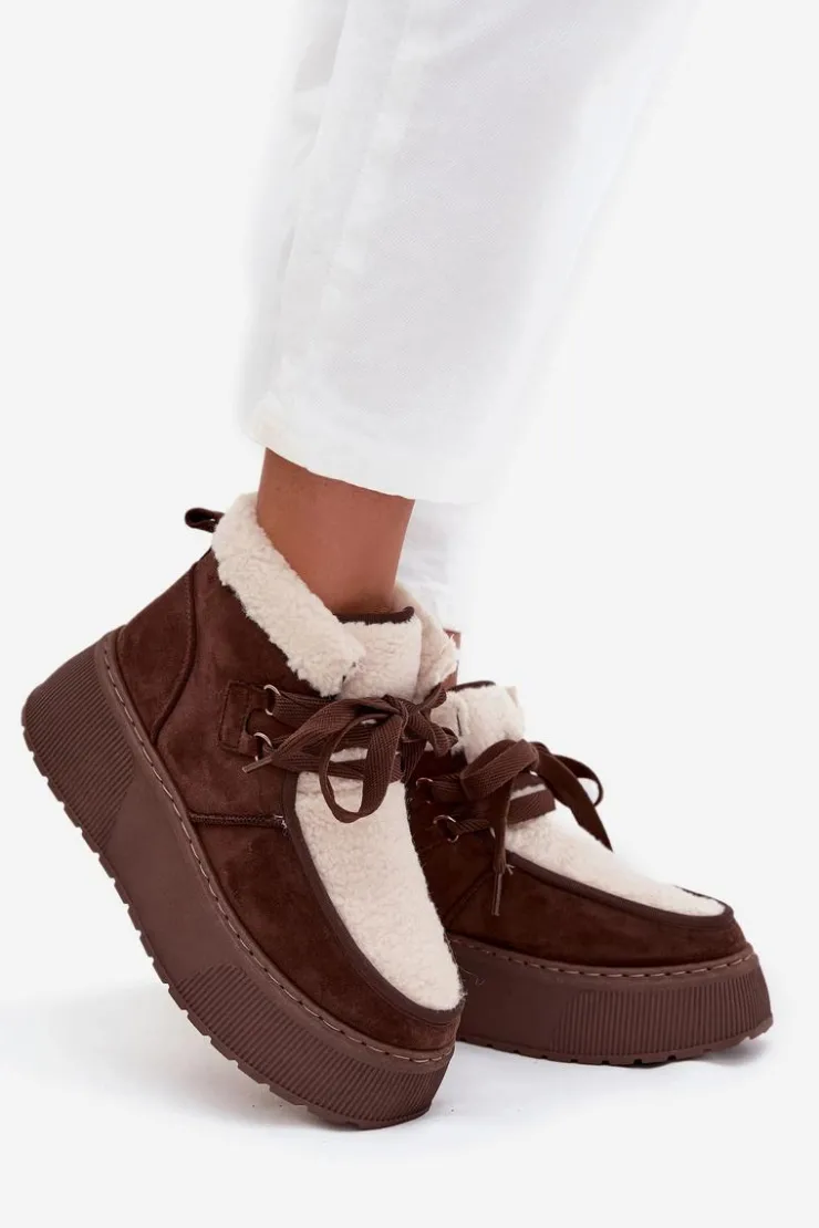 Śniegowce damskie wykonane z miękkiego eko zamszu to idealny wybór na zimowe dni. Model wsuwany ze sznurowaniem świetnie dopasowuje się do stopy, a wnętrze ocieplane futerkiem gwarantuje ciepło i wygodę. Osadzone na solidnej platformie, skutecznie izolują od chłodnego podłoża. To praktyczne i stylowe obuwie, które doskonale sprawdzi się w codziennych, zimowych stylizacjach. Przy wyborze rozmiaru prosimy sugerować się tabelą rozmiarów.