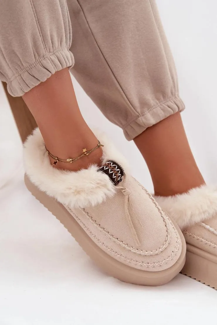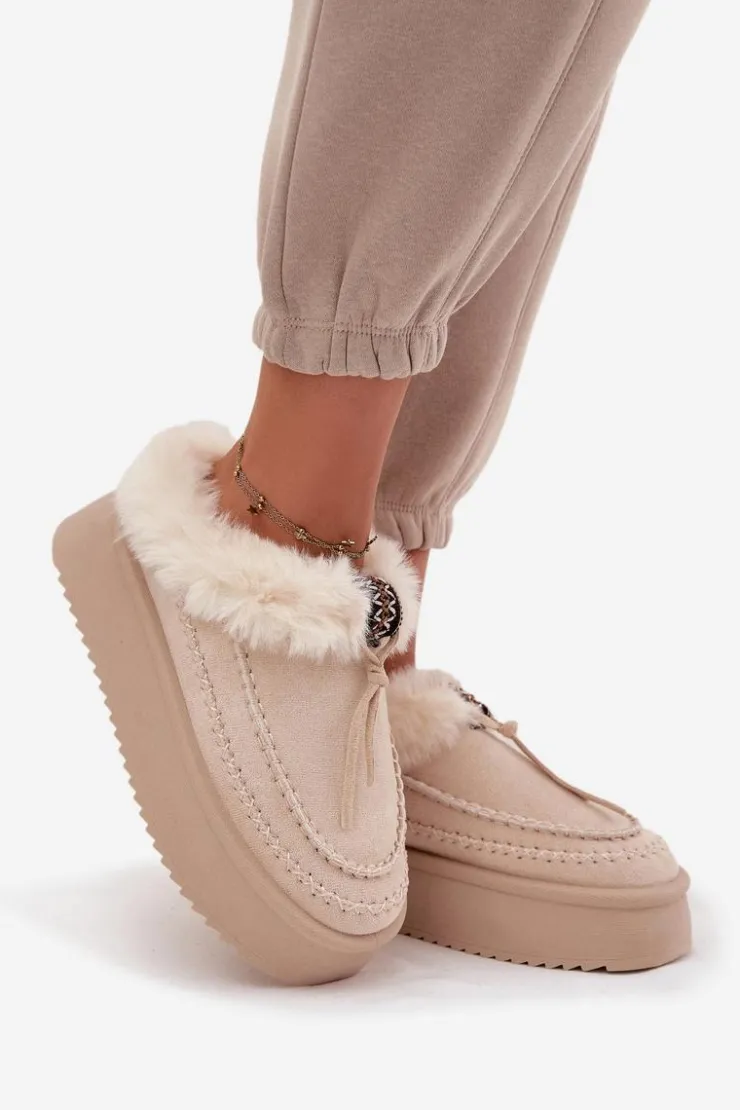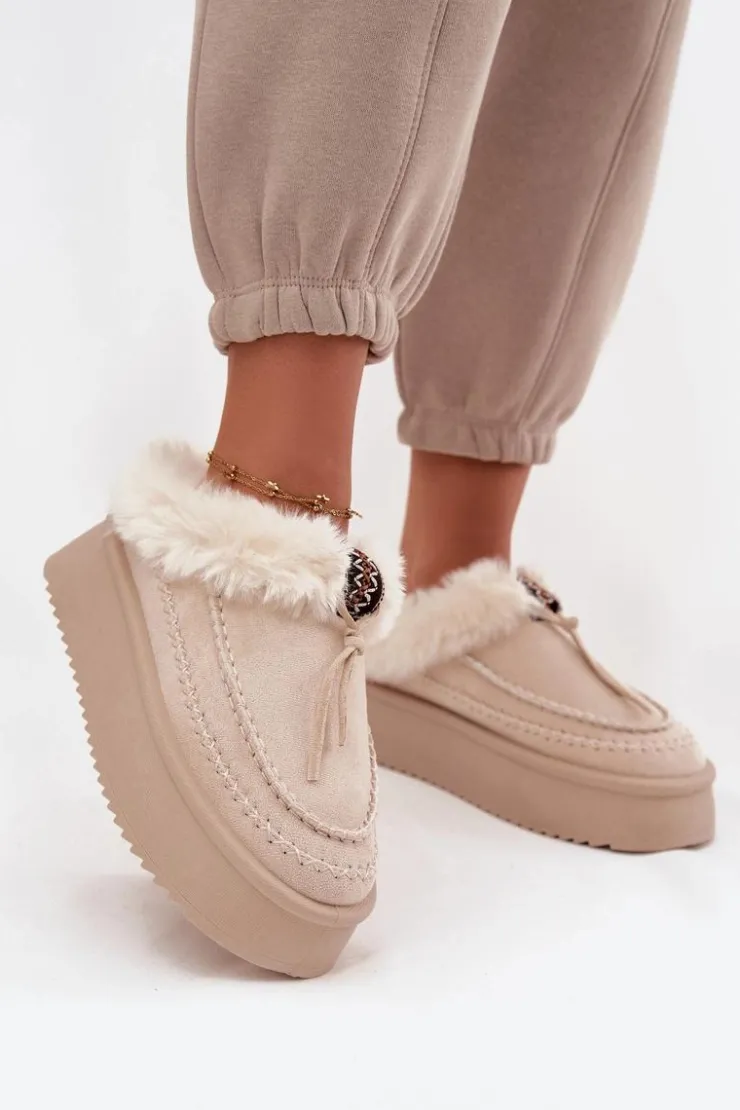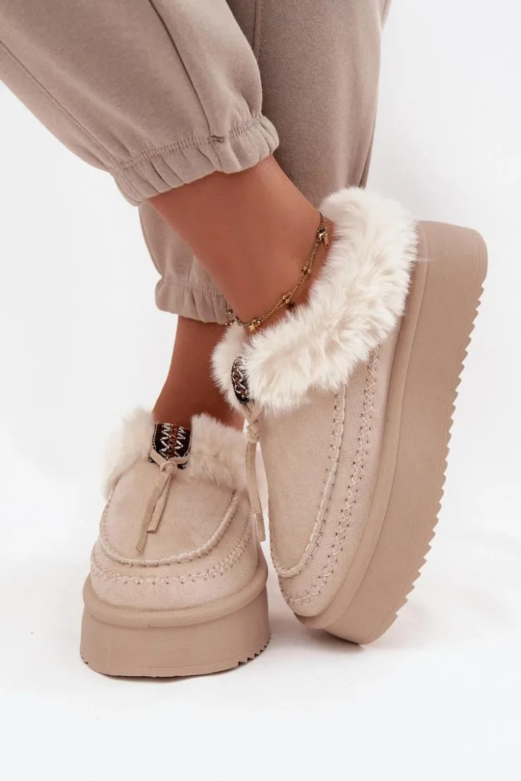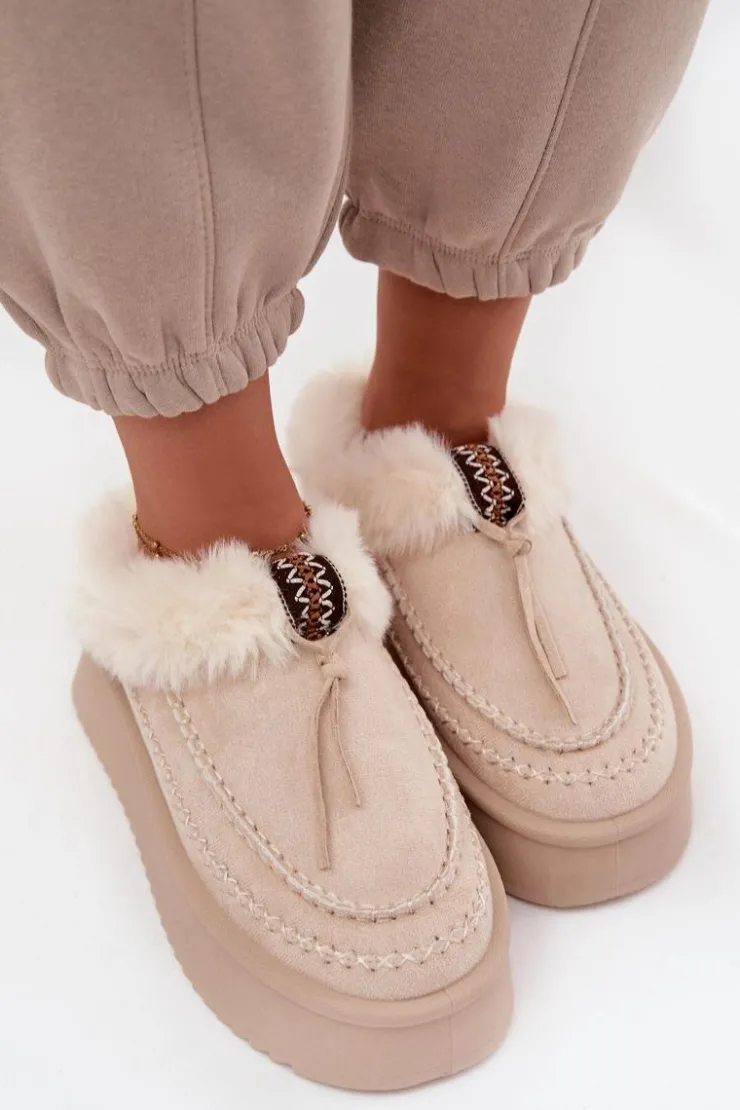 Śniegowce damskie wykonane z eko zamszu to idealne połączenie stylu i wygody na zimowe dni. Osadzone na platformie, która delikatnie wysmukla sylwetkę i doskonale izoluje od chłodnego podłoża, gwarantują komfort podczas noszenia. Górna część cholewki ozdobiona została miękkim futerkiem i dekoracyjnym paseczkiem, co nadaje całości modnego, zimowego charakteru. Wnętrze butów również ocieplone jest futerkiem, zapewniając ciepło i przyjemne otulenie stóp nawet w mroźne dni. To stylowe śniegowce, które świetnie sprawdzą się w codziennych zimowych stylizacjach.