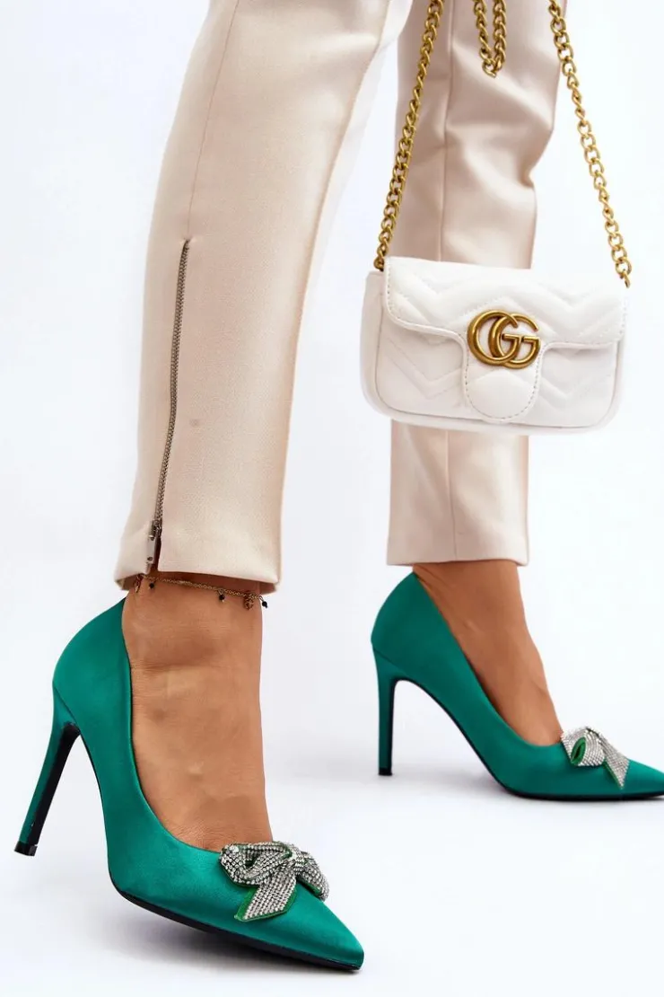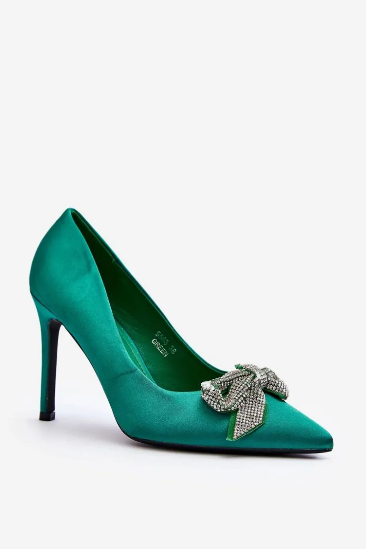 Eleganckie szpilki zostały wykonane z materiału tekstylnego imitującego satynę. Na przodzie znajduje się ozdobna kokarda z mieniącymi się dżetami. Noski w szpic optycznie wysmuklą nogi. Miękka wkładka z eko skóry zapewni wygodę podczas użytkowania. Ten model doda uroku Twoim stylizacjom! Przy wyborze rozmiaru prosimy sugerować się tabelą rozmiarów.