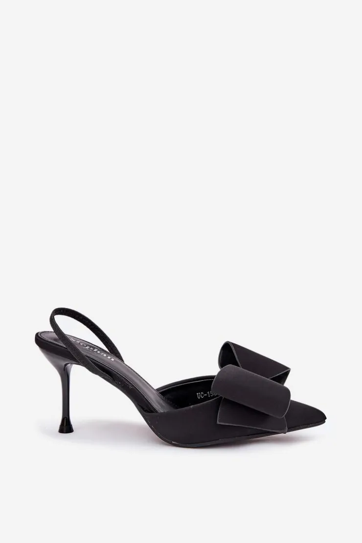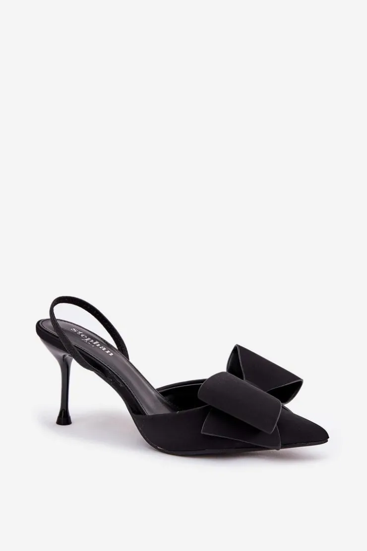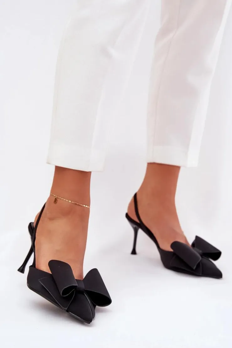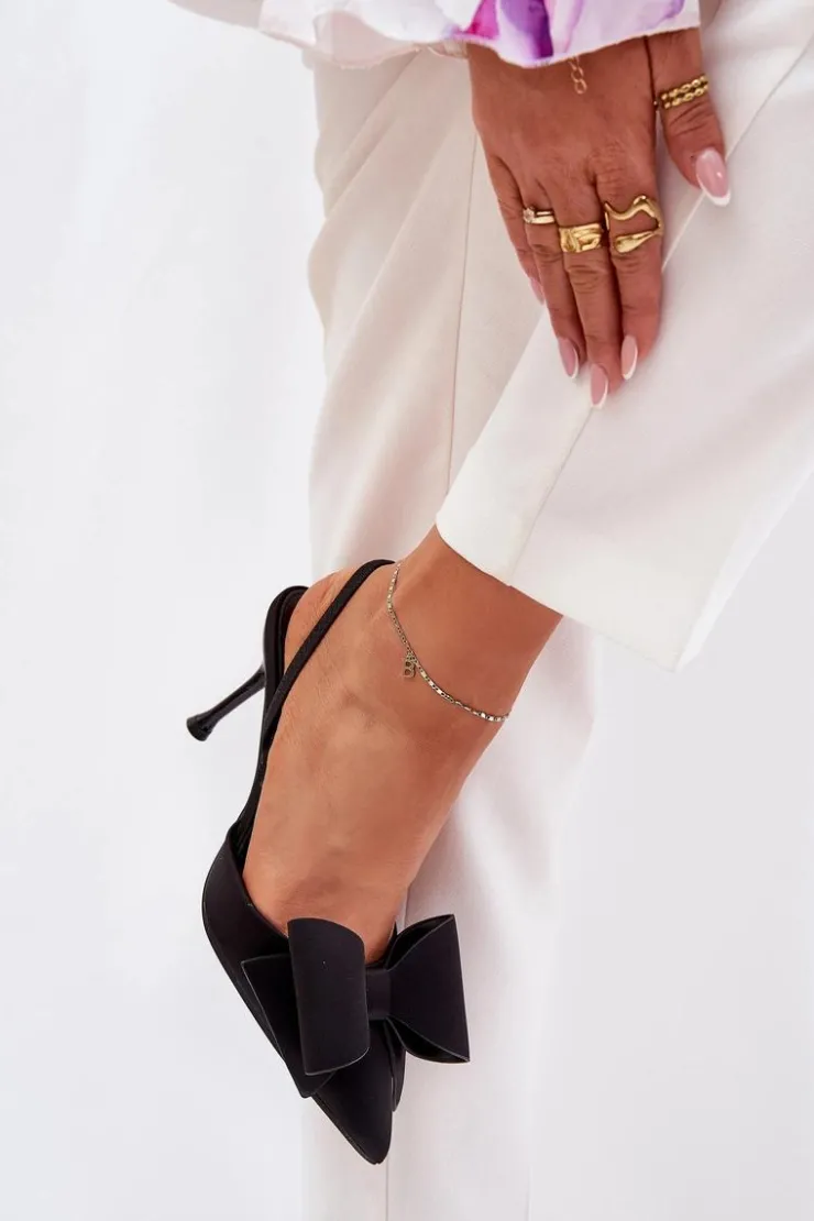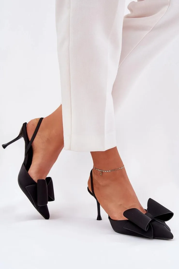 Eleganckie szpilki damskie z odkrytą piętą stanowią doskonały wybór dla kobiet, które pragną połączyć styl z komfortem. Wykonane z materiału tekstylnego. Szpiczaste noski podkreślają ich delikatną elegancję, a kokardka umieszczona z przodu dodaje im dodatkowego wdzięku. Świetnie sprawdzą się na różnorodne okazje, od oficjalnych spotkań po wieczorne wyjścia. Przy wyborze rozmiaru prosimy sugerować się tabelą rozmiarów.