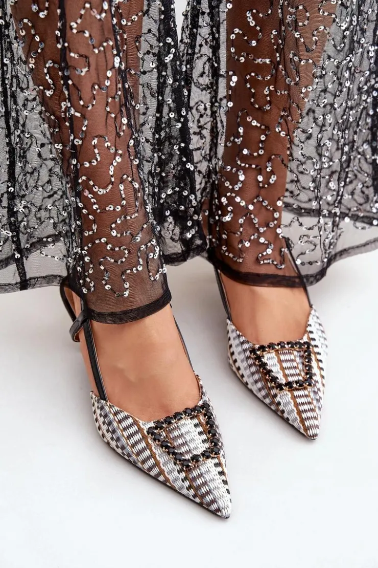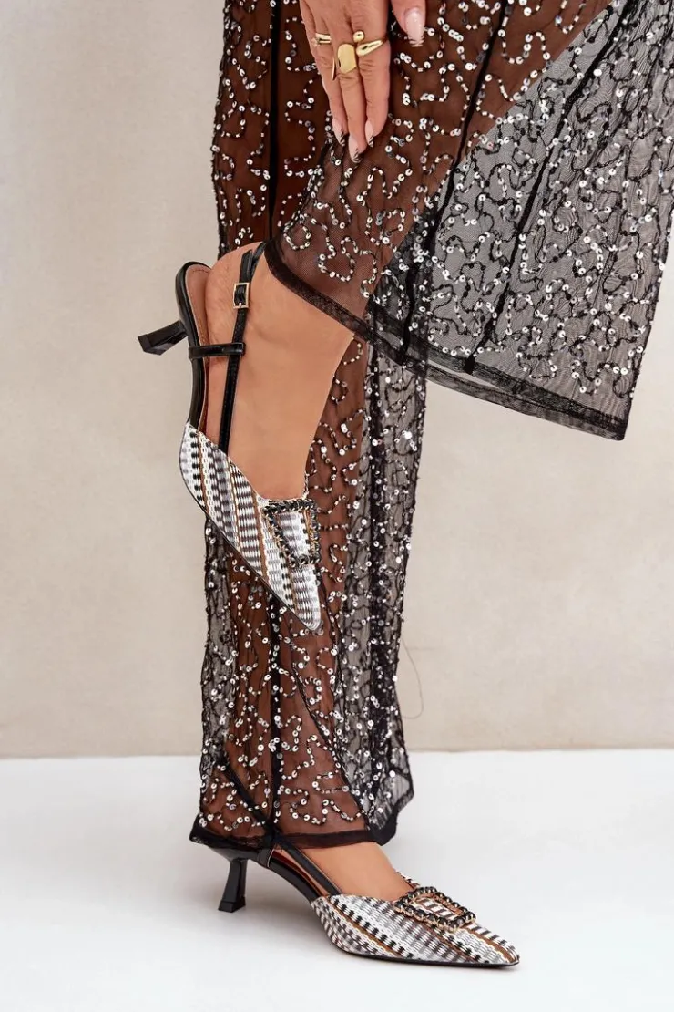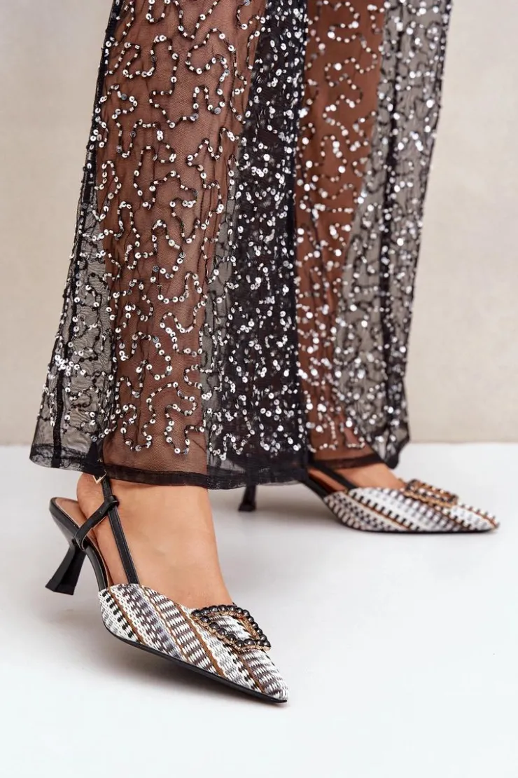 Szpilki damskie z odkrytą piętą, które zachwycają swoim wyglądem. Model z noskami w szpic optycznie wydłuża nogi, a ozdoba z przodu dodaje im wyjątkowego uroku. Zapinane na regulowany pasek ze sprzączką, zapewniają wygodę i doskonałe dopasowanie. Idealny wybór na wieczorne wyjścia i wyjątkowe okazje. Przy wyborze rozmiaru prosimy sugerować się tabelą rozmiarów.