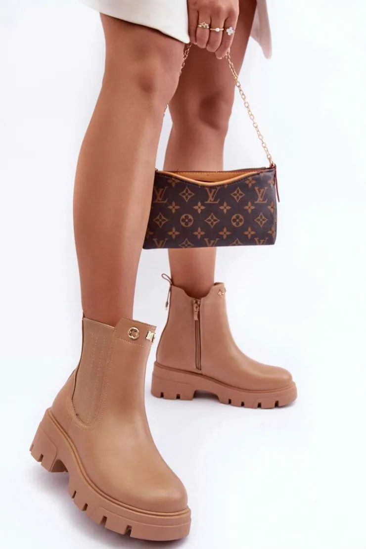 Klasyczne damskie botki osadzone na masywnym, płaskim obcasie oraz platformie. Wykonane z eko skóry. Wnętrze ocieplone kocem obuwniczym. Model zapinany na suwak. Na górze cholewki małe, złote ozdoby z tworzywa sztucznego. Koniecznie powinnaś mieć ten model w swojej szafie! Przy wyborze rozmiaru prosimy sugerować się tabelą rozmiarów.