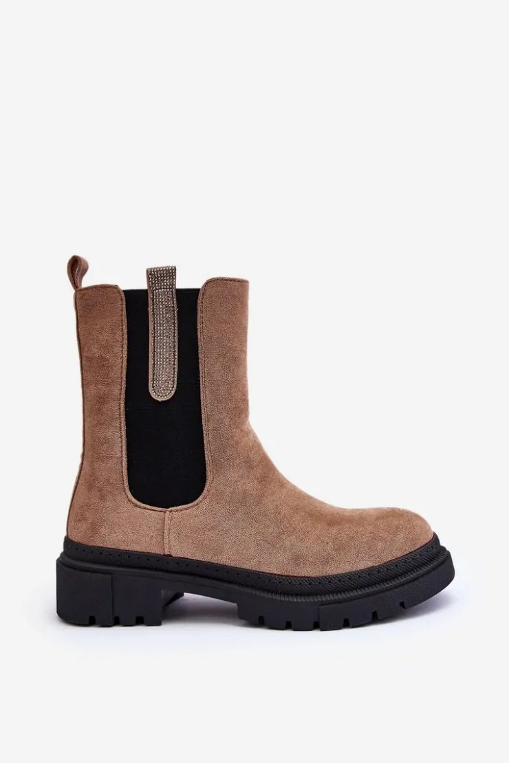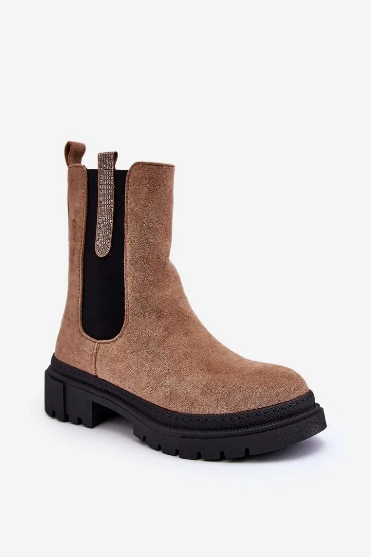 Damskie sztyblety osadzone na płaskim, stabilnym obcasie oraz platformie. Model ten wykonany jest z eko zamszu. Zapinany na suwak po wewnętrznej stronie cholewki. Na elastycznej wstawce znajduje się zdobienie w postaci małych, błyszczących dżetów. Zapiętek jest usztywniony, wnętrze ocieplone kocem obuwniczym. Przy wyborze rozmiaru prosimy sugerować się tabelą rozmiarów.