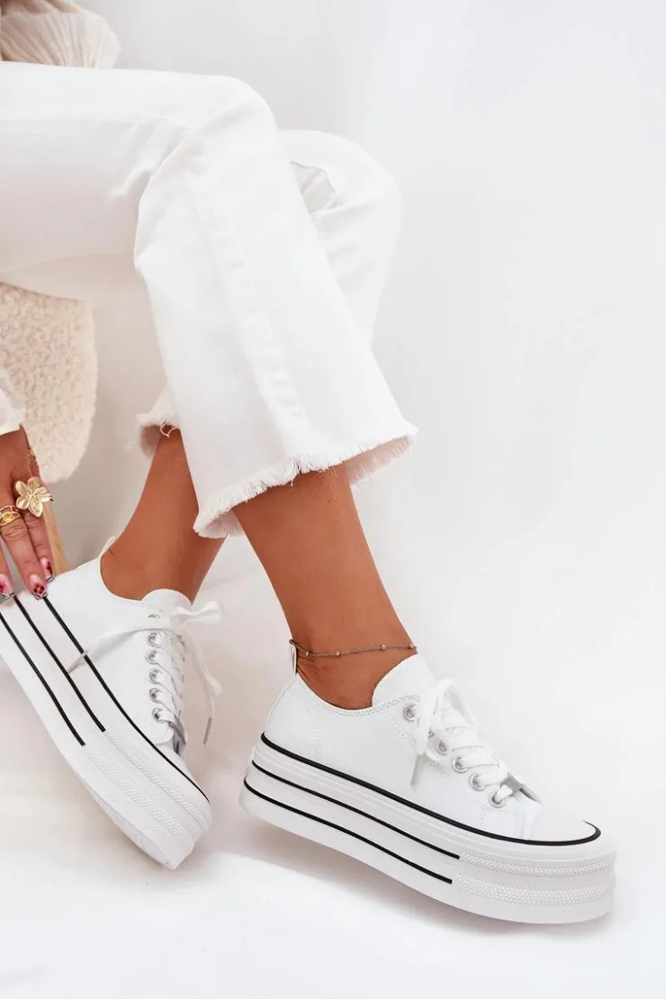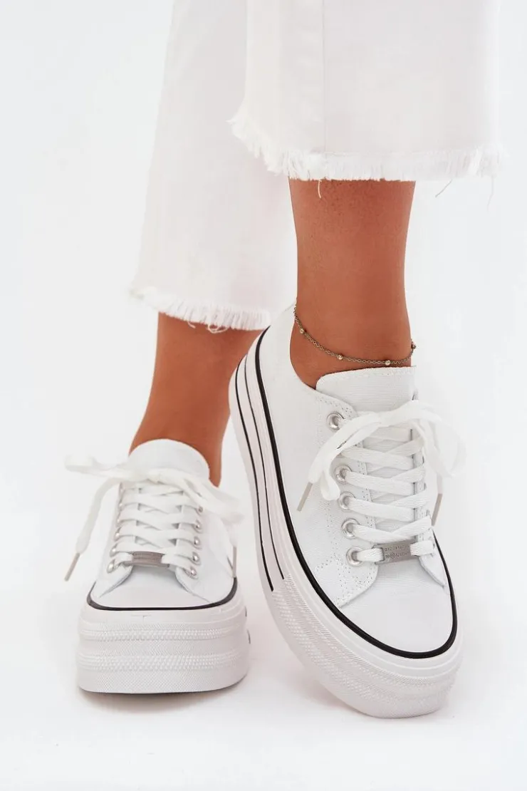 Trampki damskie wykonane z materiału tekstylnego, osadzone na masywnej platformie, która optycznie wysmukla sylwetkę. Niska cholewka i klasyczne sznurowanie zapewniają wygodę oraz idealne dopasowanie. Stylowy fason sprawia, że te trampki doskonale komponują się z codziennymi stylizacjami. Przy wyborze rozmiaru prosimy sugerować się tabelą rozmiarów.