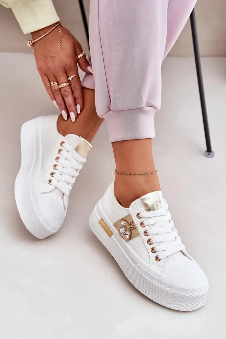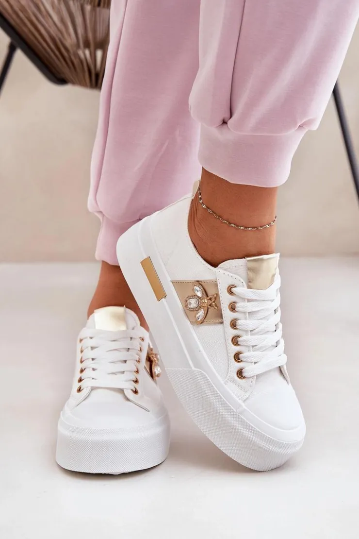 Stylowe trampki damskie wykonane z materiału tekstylnego. Osadzone na masywnej platformie, która dodaje modnego charakteru. Zaokrąglone noski zapewniają wygodę i swobodę ruchu, a ozdobny detal na boku cholewki dodaje im unikalnego stylu. Miękka piankowa wkładka gwarantuje komfort przez cały dzień, zapewniając odpowiednią amortyzację na każdym kroku. Idealne do codziennych stylizacji. Przy wyborze rozmiaru prosimy sugerować się tabelą rozmiarów.