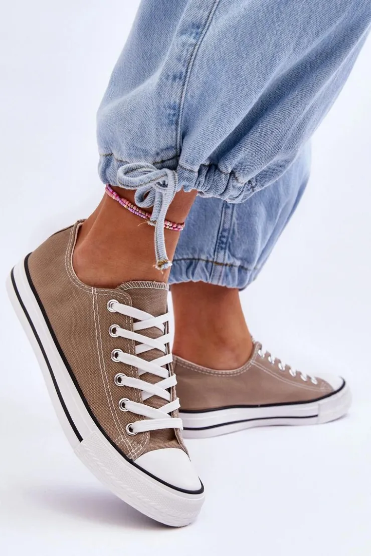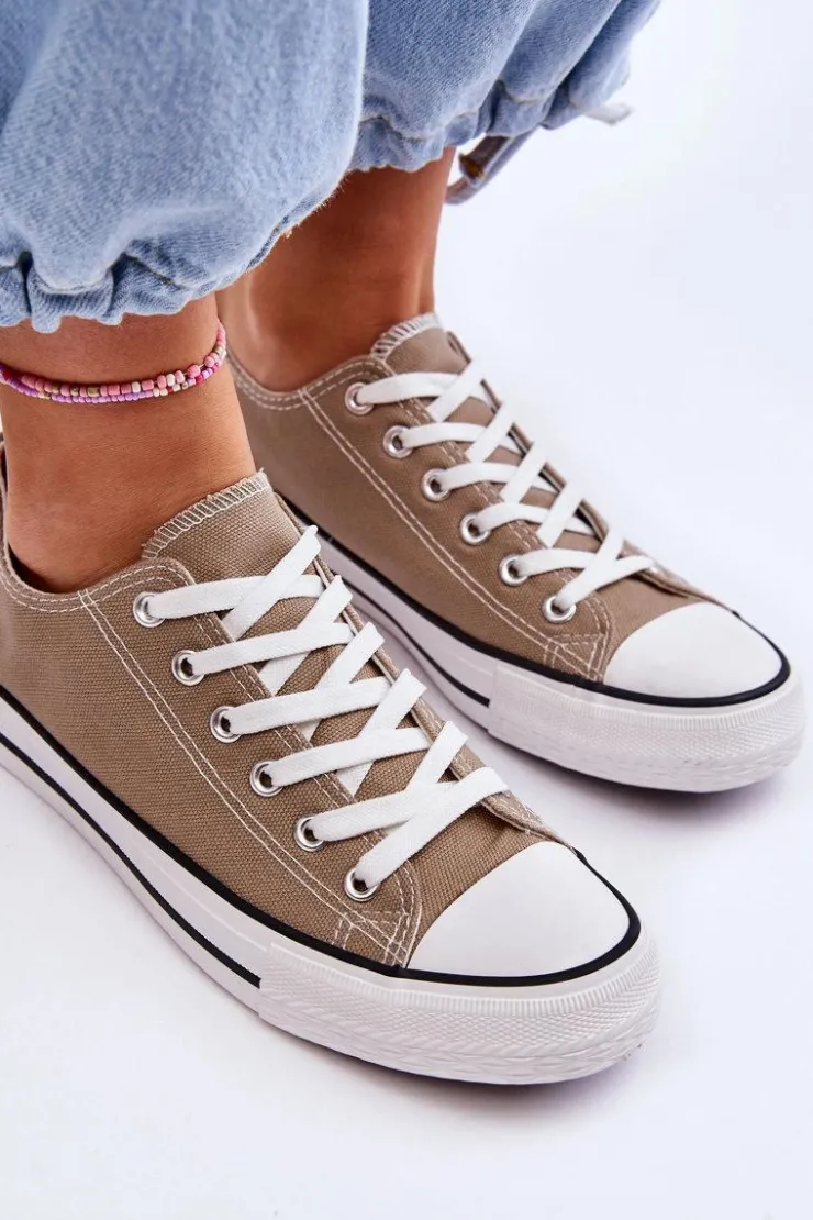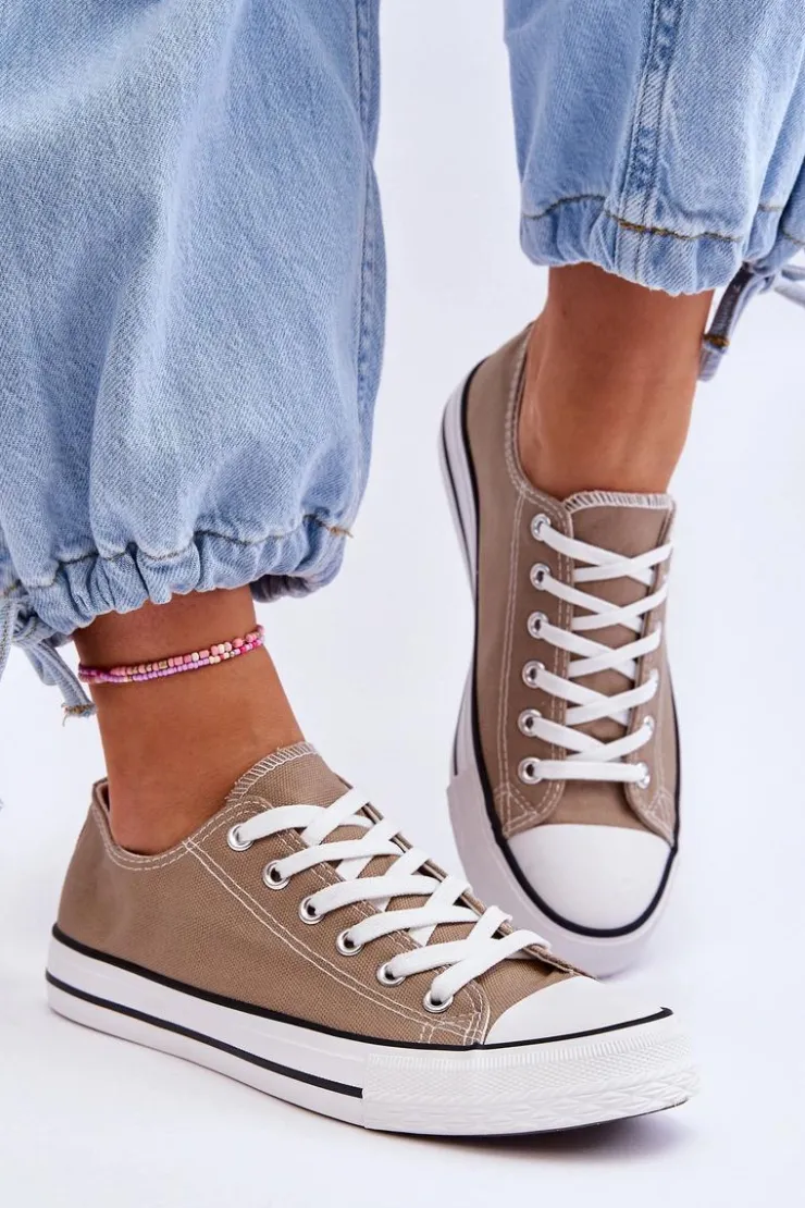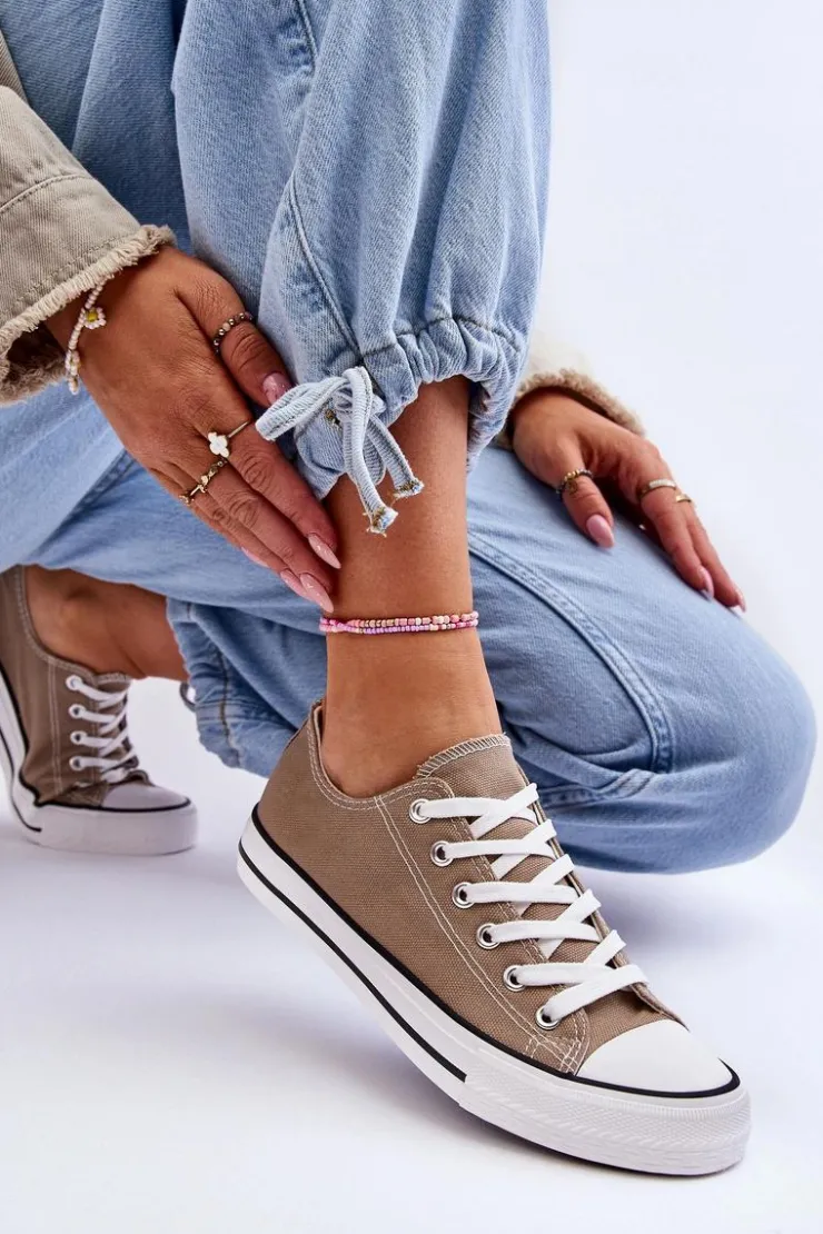 Klasyczne, sznurowane trampki damskie zostały wykonane z materiału tekstylnego. Posiadają gumową podeszwę, która jest dodatkowo antypoślizgowa. Ponadczasowy model, który powinnaś mieć w swojej szafie! Z pewnością założysz je do wielu stylizacji! Nosek został wzmocniony gumowym tworzywem. Wygodna, materiałowa wkładka zapewni komfort podczas użytkowania. Przy wyborze rozmiaru prosimy sugerować się tabelą rozmiarów.