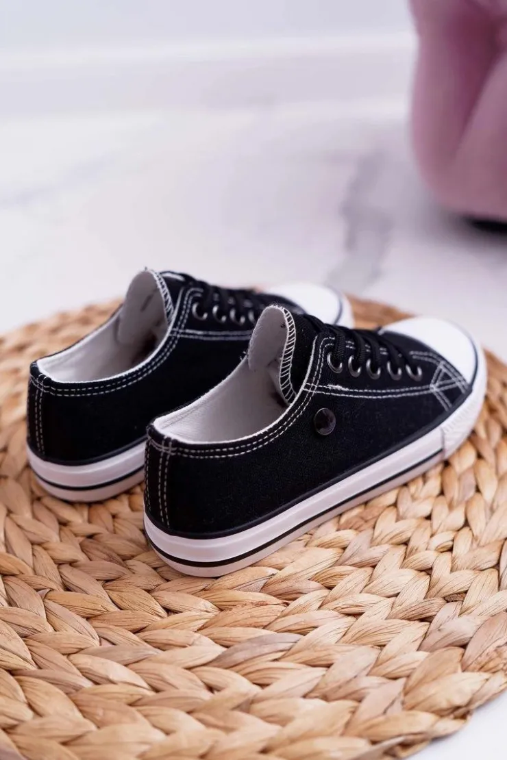 Klasyczne trampki wykonane z materiału tekstylnego. Ponadczasowy wzór w wersji młodzieżowej. Zastosowanie gumowego noska sprawia że buciki pięknie wyglądają oraz są bardziej odporne na uszkodzenia. Zakładanie i dopasowanie do stopy ułatwią elastyczne gumki. Przy wyborze rozmiaru prosimy sugerować się tabelą rozmiarów dostępną po najechaniu bądź kliknięciu na dany rozmiar.