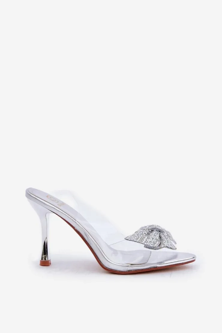 Eleganckie transparentne sandały na szpilce, które idealnie podkreślą wyjątkowy charakter Twojej stylizacji. Model wyróżnia się efektowną, błyszczącą kokardą z przodu, dodającą odrobinę glamour. Model ten doskonale komponują się z sukniami koktajlowymi oraz eleganckimi kompletami, tworząc szykowny i modny look. Przy wyborze rozmiaru prosimy sugerować się tabelą rozmiarów.