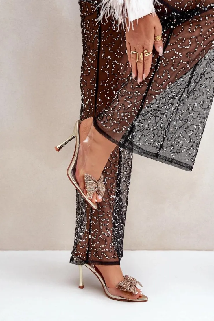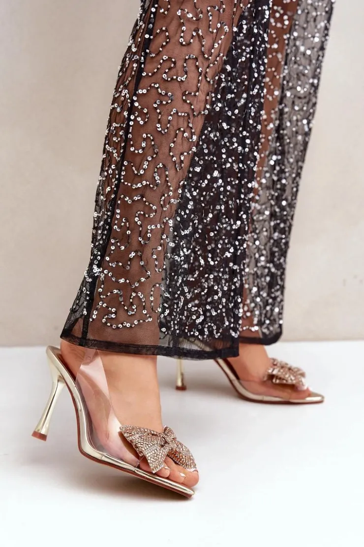 Eleganckie transparentne sandały na szpilce, które idealnie podkreślą wyjątkowy charakter Twojej stylizacji. Model wyróżnia się efektowną, błyszczącą kokardą z przodu, dodającą odrobinę glamour. Model ten doskonale komponują się z sukniami koktajlowymi oraz eleganckimi kompletami, tworząc szykowny i modny look. Przy wyborze rozmiaru prosimy sugerować się tabelą rozmiarów.