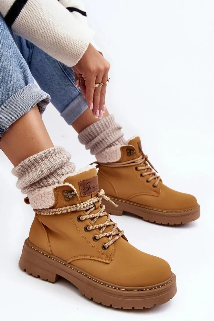 Trapery damskie wykonane z eko skóry. Osadzone na platformie oraz płaskim obcasie z gumowego tworzywa. Góra cholewki oraz wewnętrzna strona języka ocieplona syntetycznym kożuchem. Noski Zaokrąglone. Ten klasyczny model traperów zachwyci każdego! Przy wyborze rozmiaru prosimy sugerować się tabelą rozmiarów.