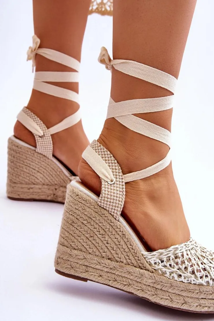 Modne i wygodne sandały osadzone na obcasie w postaci koturnu ozdobionego jutową plecionką. Sandały posiadają antypoślizgową podeszwę wykonaną z gumowego tworzywa. Cholewka została wykonana z połączenia tkaniny oraz tworzywa sztucznego. Sandałki posiadają wiązanie wokół kostki. Wkładka z eko skóry pozwala na komfortowe użytkowanie obuwia. Przy wyborze rozmiaru prosimy sugerować się tabelą rozmiarów.