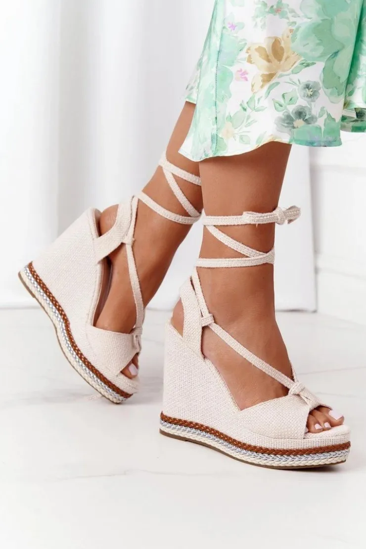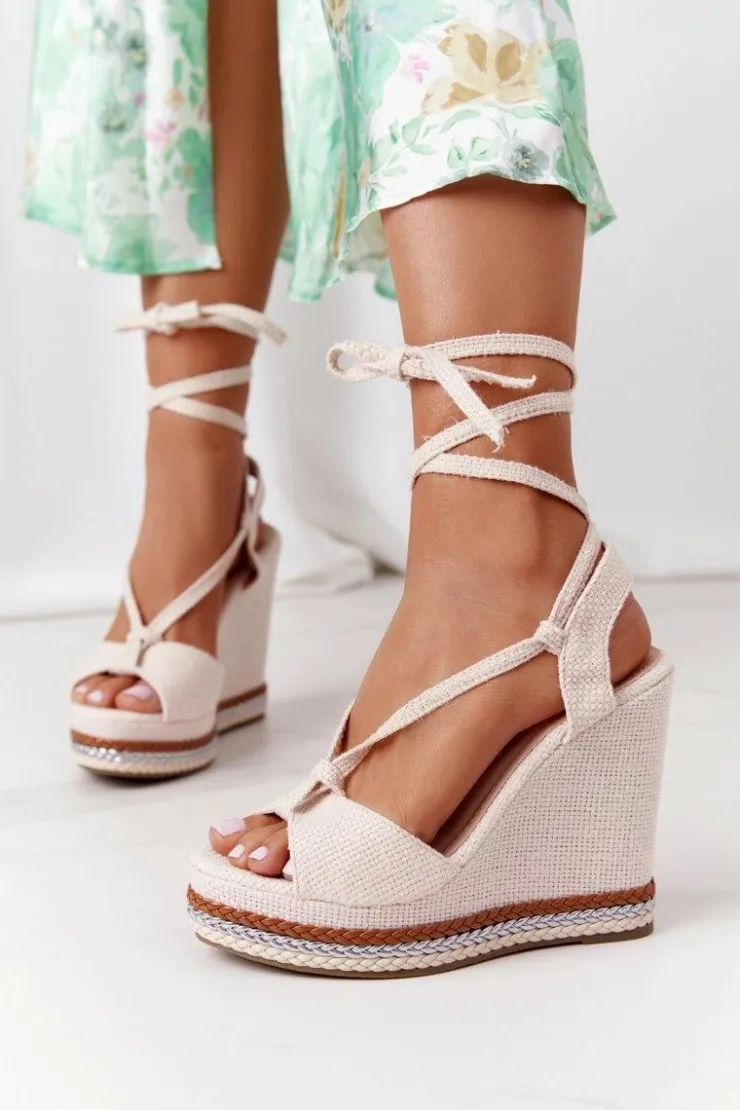Piękne sandały na koturnie z wiązaniem wokół kostki. Sandały zostały wykonane z plecionej tkaniny, posiadają miękką wkładkę z eko skóry oraz antypoślizgową podeszwę. Wyjątkowy model wzbogaci Twoją letnią garderobę! Przy wyborze rozmiaru prosimy sugerować się tabelą rozmiarów.