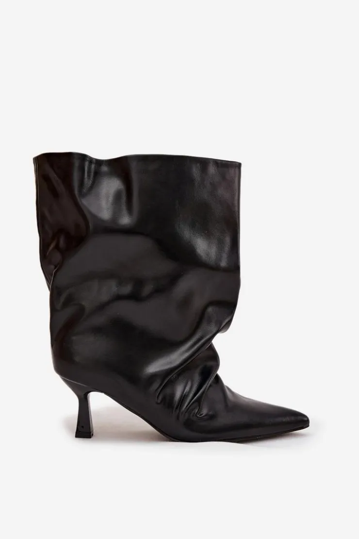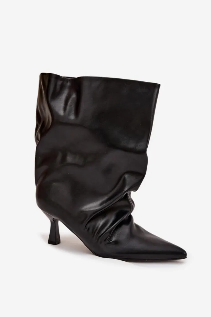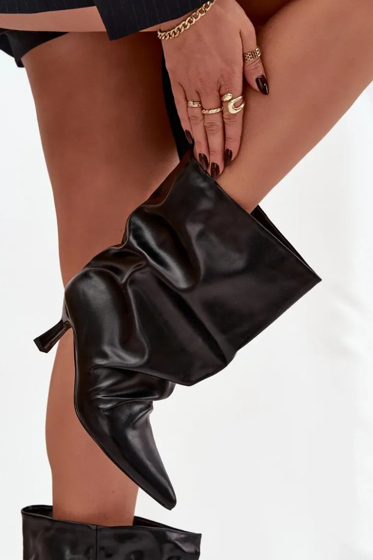 Botki damskie wykonane z eko skóry to stylowy model, który łączy elegancję z modnym akcentem. Osadzone na smukłej szpilce, pięknie podkreślają sylwetkę i dodają kobiecego wdzięku. Wsuwany fason zapewnia wygodę zakładania, a szeroka, marszczona cholewka nadaje im wyjątkowego, nowoczesnego charakteru. To efektowne botki, które doskonale uzupełnią zarówno codzienne, jak i wieczorowe stylizacje. Przy wyborze rozmiaru prosimy sugerować się tabelą rozmiarów.