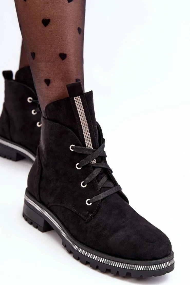 Botki damskie z niską cholewką wykonane z eko zamszu. Model wsuwany ze sznurowaniem. Noski zaokrąglone. Środek ocieplony kocem obuwniczym. Usztywniony zapiętek. Płaski obcas zapewni stabilność na każdym kroku. Małe, błyszczące dżety na języku. Koniecznie powinnaś mieć ten model w swojej szafie! Przy wyborze rozmiaru prosimy sugerować się tabelą rozmiarów.