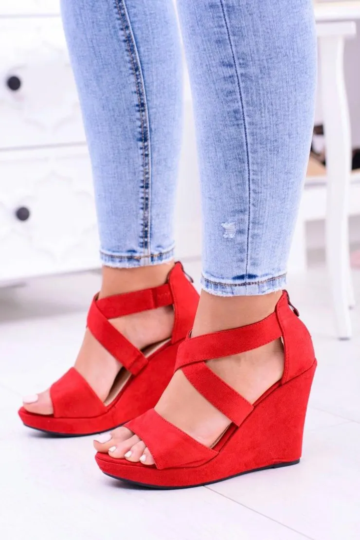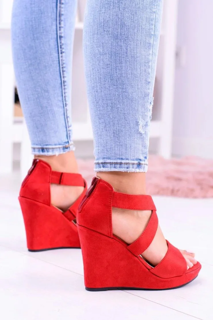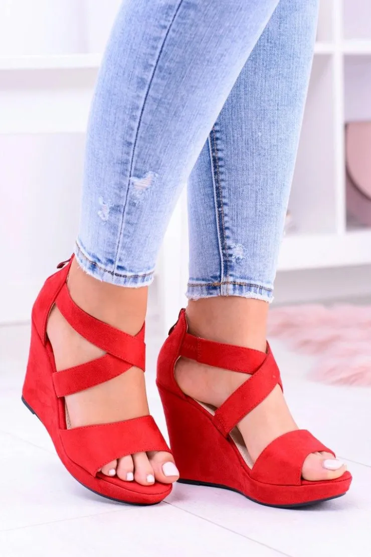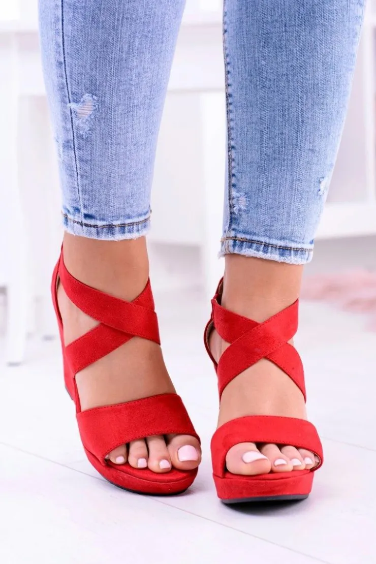 Damskie Boto Wygodne Damskie Czerwone Sandały Koturny Mirabet