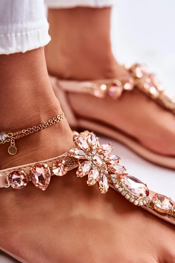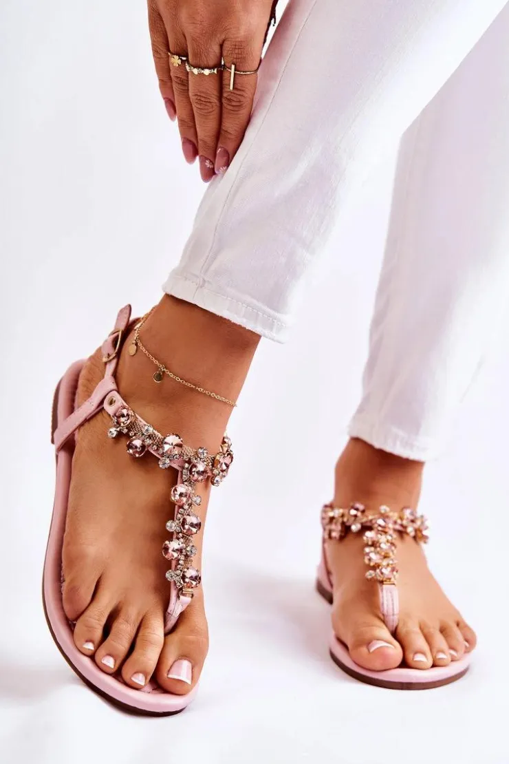Wygodne sandały w stylu japonek świetnie prezentują się z letnimi stylizacjami. Buty te zostały wykonane z eko skóry. Wkładka jest dodatkowo pikowana. Na paseczkach znajdują się dżety w postaci kryształów oraz cyrkonii. Model zapinany na sprzączkę z regulowanym paskiem, dzięki któremu możesz je odpowiednio dopasować do tęgości nogi. Osadzone na płaskim obcasie z antypoślizgową podeszwą. Przy wyborze rozmiaru prosimy kierować się tabelą rozmiarów.