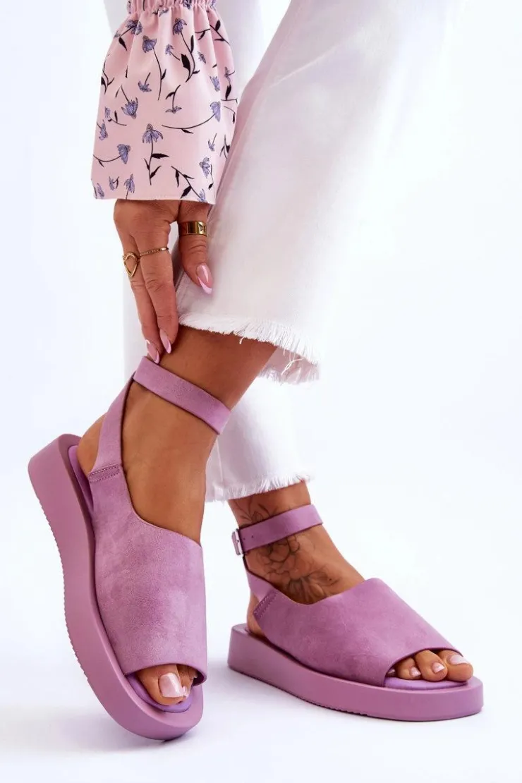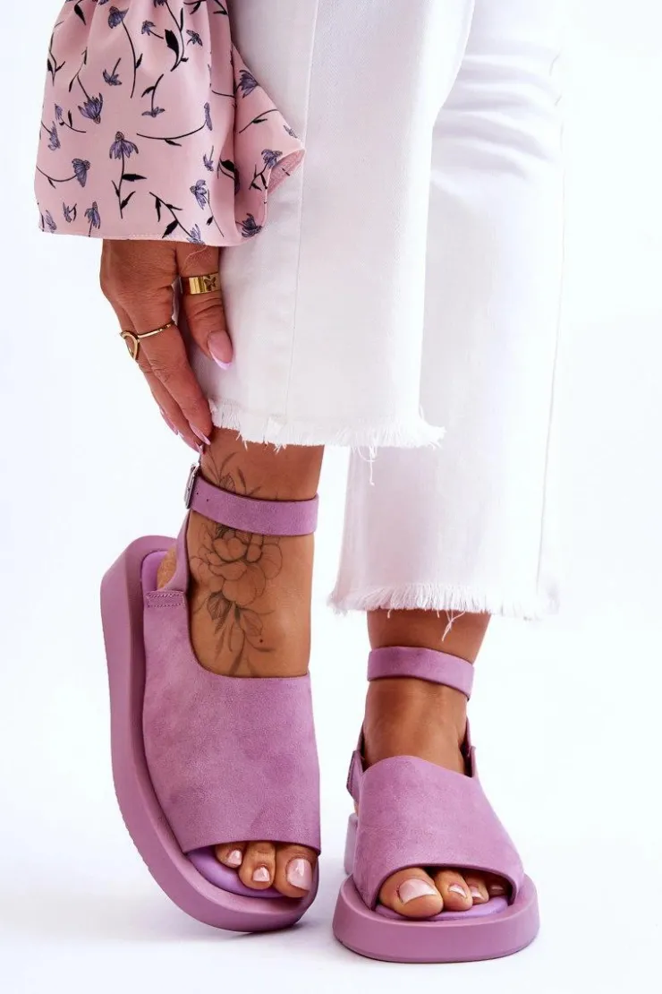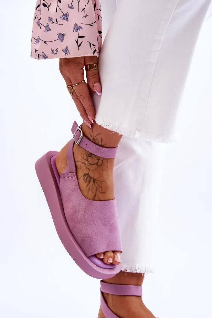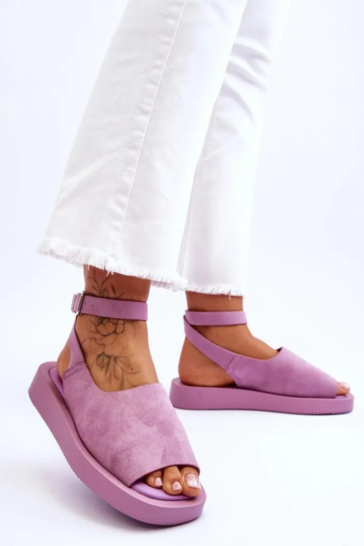 Wyjątkowe sandały damskie na platformie. Buty te zostały wykonane z miłego w dotyku eko zamszu. Posiadają miękką, eko skórzaną wkładkę. Sandałki są zapinane wokół kostki na regulowany pasek ze sprzączką. Ten niezwykły model z pewnością wzbogaci Twoją letnią garderobę! Przy wyborze rozmiaru prosimy sugerować się tabelą rozmiarów.