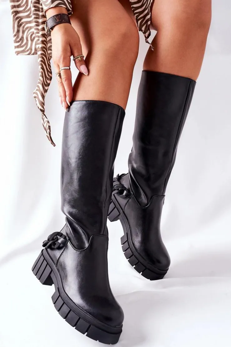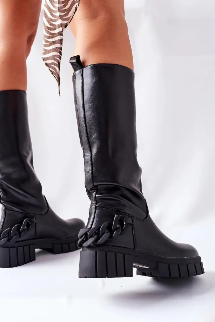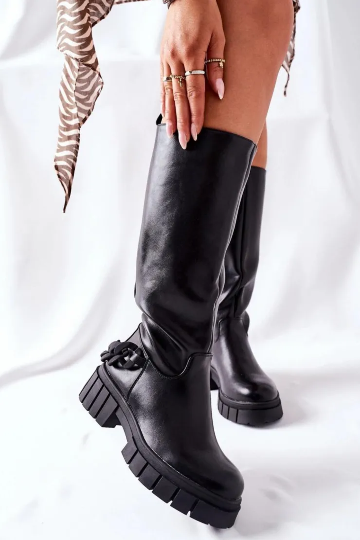 Kozaki do kolana wykonane ze skóry ekologicznej. Wnętrze ocieplane kocem obuwniczym. Posiadają ozdobny łańcuch na pięcie.